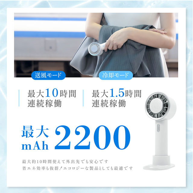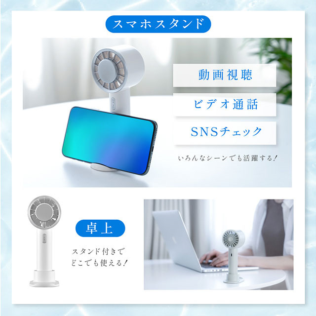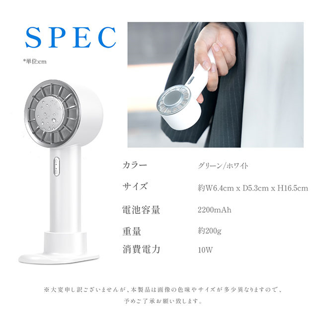 | 仕様 | ◆商品名:ハンディ扇風機 ◆商品サイズ:約W6.4*D5.3*H16.5CM ◆定格電圧:DC5V ◆商品電力:10W ◆商品質量:約200G ◆内蔵電池:2200MAH ◆強度調節:3段階(風速)/1段階(冷却モード) ◆カラー:ホワイト・ブルー・ネイビー |