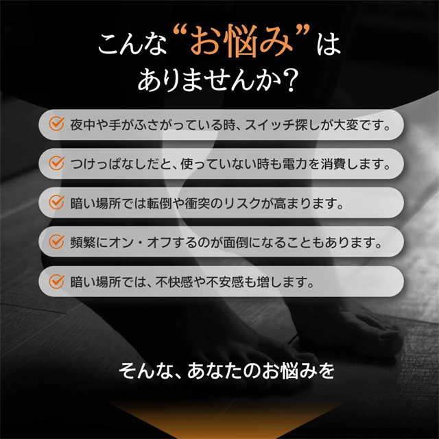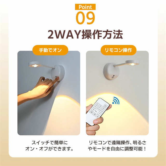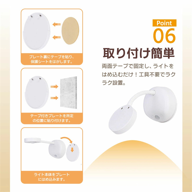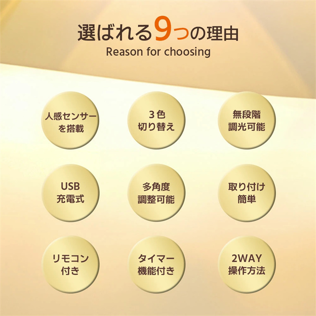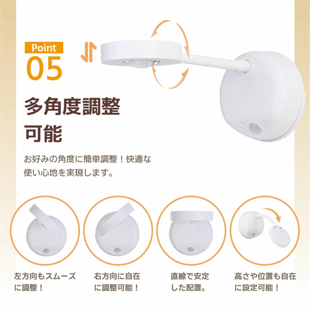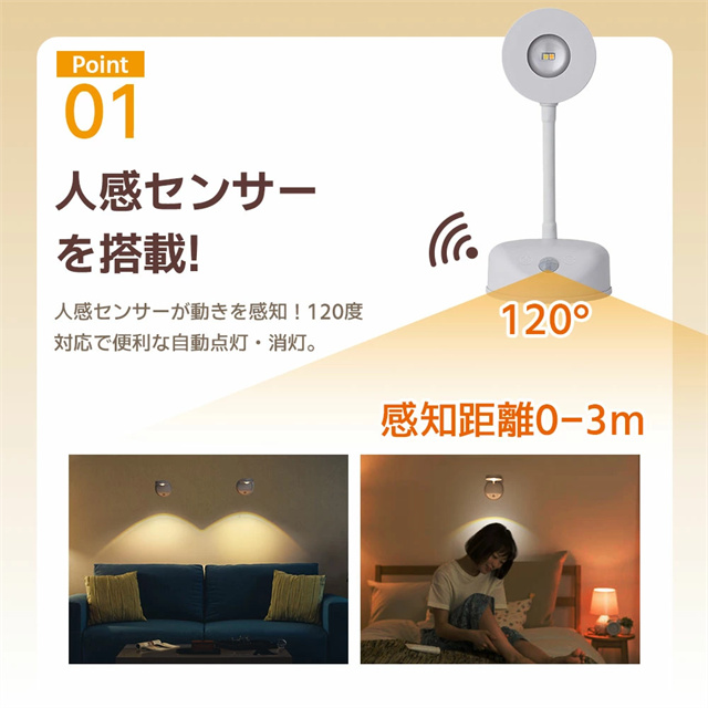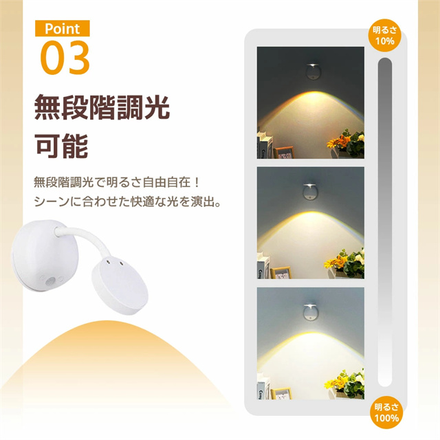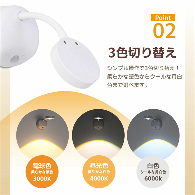 | ポイント | 【3色調光&無段階調光】 光の色と明るさを自在にコントロールし、3色(ホワイト/ウォーム/ニュートラル)を自由に切り替えることができ、部屋の雰囲気を一変させます。設定ボタンを長押しすると、夜間のさまざまな照明ニーズに合わせてライトの明るさを自由に調整できます。常時点灯モードと感知モードを設定でき、光はソフトで眩しくなく、ちらつきがなく、健康によく目を保護します。 【大容量バッテリー】 2200mAhの内蔵バッテリーを搭載され、約3時間の充電で、常時点灯モードでは10時間使用でき、感知モードでは30日間使用できます(1日あたりセンサーライト5〜8回で計算) また、充電しながら使用することもできます。電池不要のUSB充電式なので、電池の買い替えの必要がなく、省エネでランニングコストも抑えて使用できます。 【2種類操作方法&操作が便利】 強化型モデルはタッチ操作の上にリモコン操作を追加して、2つの操作方法を搭載しています。リモコンは7メートルの範囲内で明るさや色温度を自由に調整することができます。頻繁的に取り外して調整したり消灯したりする必要がありません。リモコンボタンがわかりやすく、使いやすいデザインで、1つのリモコン最多7台まで同時にコントロールできます。自宅に当ブラケットライトが複数であれば、1つのリモコンで消灯、照明モードを調整することができます。 【設置が簡単:2種類の設置方法が選べます】 貼り付け式で設置し、ナノ粘着剤を備え、強力で、取り外しやすく、壁を傷つけく、目標位置に直接貼り付けることができます。2.穴あき設置。製品は両方の設置方法のアクセサリーが付属しています。配線不要で、いつでも取り外して充電できます。 【どこでも使用可能】 デスクライト、読書灯、ベッドサイドランプ、ナイトライト、懐中電灯として、子供の部屋、階段、廊下、地下の部屋、倉庫、車内、クローゼット、トイレ、デスク、ベッドサイド、バスルーム、リビングルーム、納戸、物置、学習机、本棚、収納、ガレージ、キャビネット、メイクアップ、バスルーム、キッチンなどどこにでも簡単取り付け、夜の行動が便利になります。 |