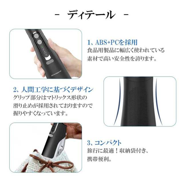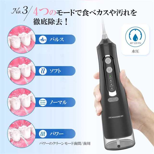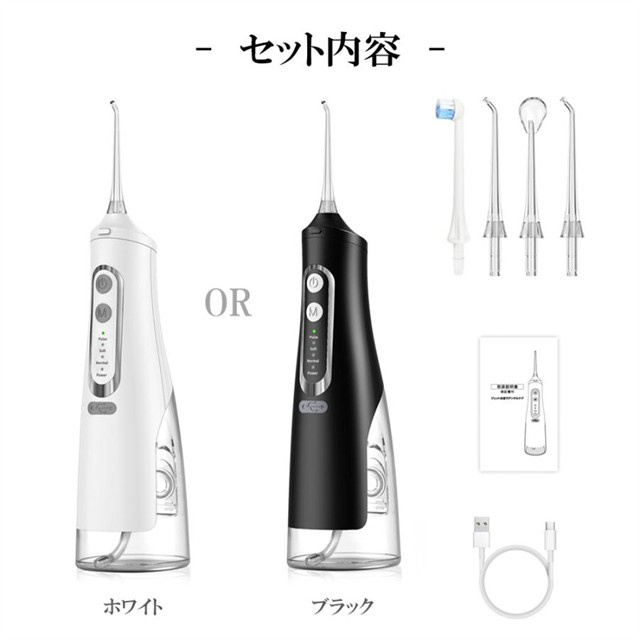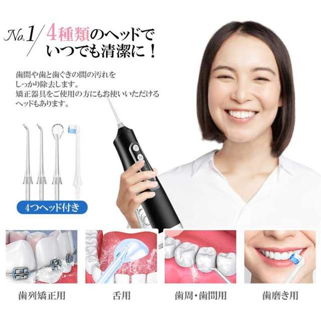 | この口腔洗浄器が選ばれる理由 | ノズルの先端からタンク内に貯めた水を噴射して口内を洗浄するものですが、水圧はかなり強く、歯に当てれば食べカスはもちろん、歯垢まで取ってくれます。日常的に歯や歯茎のケアを行って口内を清潔に保ちたい方は、ぜひ試してみてくださいね。人とのコミュニケーションにおいても、口臭のない健康なお口はとても重要ですよね。口腔洗浄器は、水を噴射して口の中を洗うという非常にシンプルな器具ですが、効果は抜群です。 ■■水圧によって舌の汚れを除去する舌磨きノズルを搭載■■ 超音波水流の微細な気泡によって、歯の表面についた汚れをはがして飛ばします。舌磨きノズルも搭載しており、舌の表面についた汚れも除去。歯だけでなく、舌のケアにも力を入れたい人におすすめです。 ■■本体をタンクに収納できて持ち運びしやすい■■ 本体とノズル部分をタンクに収納するとコンパクトになるため、自宅はもちろん職場や外出先などへの携帯用としても活躍するでしょう。1分間に約1600回の高速振動により、歯ブラシだけでは届かない箇所の汚れも除去します。本体はまるごと水洗いでき、清潔に保てます。コンパクトに持ち運んで、外出先でも歯のケアを怠りたくない人におすすめですよ。 ■■1回の充電で長く使える。お風呂でもOK■■ バッテリーを内蔵した充電式のため、コンセントがない場所でも使えます。シンクまわりに置いても邪魔になりにくく、使わないときには収納してもかさ張らないところが魅力です。4段階で水圧モードを切り替えられて、歯ぐきの状態や好みに合わせたケアが可能です。本体はIPX7の防水設計で、充電口にも防水カバーがあるためお風呂でも活用できますよ。 ■■4種類のノズルで口臭対策や歯ぐきケアも■■ 歯周ポケット用・矯正用・舌クリーナー用など4種類のノズルが付属しており、用途に合わせた洗浄が可能です。4種類のモードを選択することで適した強さが選べます。 |