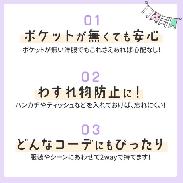 | 商品説明 | 【小物をまとめて手ぶらでお出かけ】 ・クリップで挟むだけ◎ポケットのないお洋服に、取り付けできる「ショルダー付きマルチポッケ」 【ポケットがなくても大丈夫!】 ・スカートやズボンに装着すると、ポケット代わりに◎お子さま1人でも付け外しがスムーズ。 【開閉しやすく安心の面ファスナー式】 ・面ファスナー式開口フラップ。大きく開いて出し入れしやすく、閉じればこぼれ落ちをガード。 【マストアイテムの持ち歩きに便利】 ・2段式の収納スペース。薄手のハンカチやヘアアクセサリー、キャンディ、マスクなどを。 【ティッシュもサッと取り出し可能】 ・フラップ内側には、ポケットティッシュを。中央から取り出しやすいつくり。 【ポシェットのように持てる2way】 ・スナップボタンで着脱できるショルダー。2段階長さ調節でき、ちょこんと掛けて持ち歩ける♪ 【お気に入りをいつでも相棒に】 ・気分の上がる、可愛らしいデザインをラインナップ。お友達へのプレゼントにもおすすめ☆ (※)カラーにより、フラップ前面クリアポケットの有無が異なります。 【ポケット仕様】 ・内側:ティッシュポケット×1 ・前面:クリアポケット×1(カラーにより異なります) |