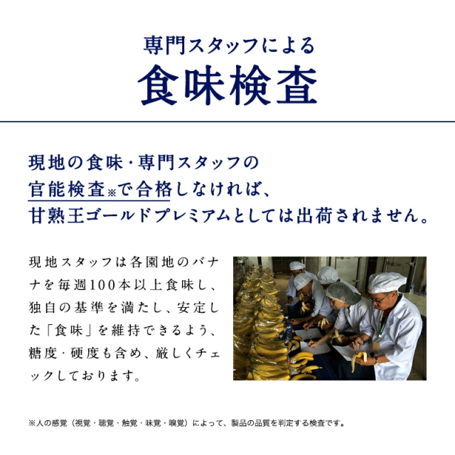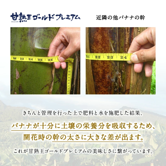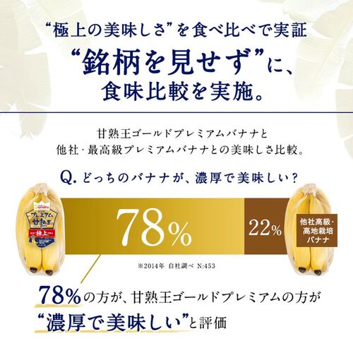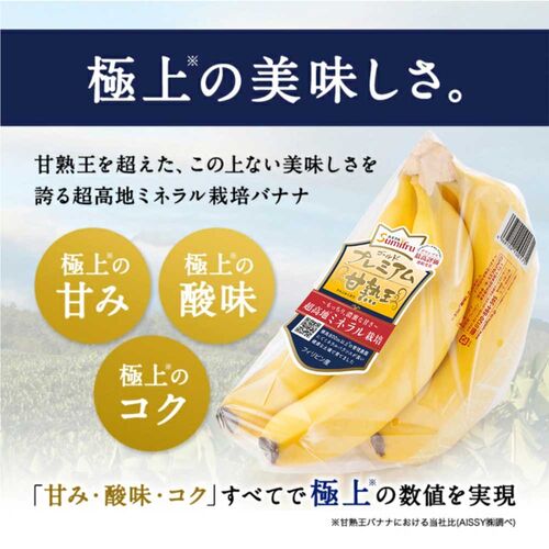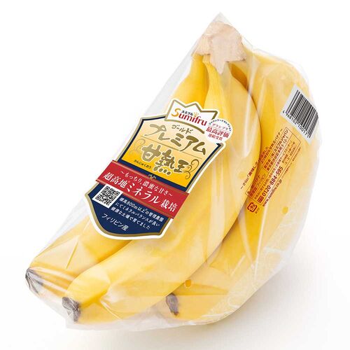 甘熟王を超えた「ゴールドプレミアム」。もっと美味しいバナナをお届けするため、甘熟王農園の中でも標高が高く、土壌のミネラルバランスが最も良いゴールドエリア限定で育てた「超高地ミネラル栽培バナナ」です。時間と手間をかけて大切に育てた、スミフルで甘くて一番美味しい“もっちり、濃蜜な甘さ”をぜひご堪能ください。