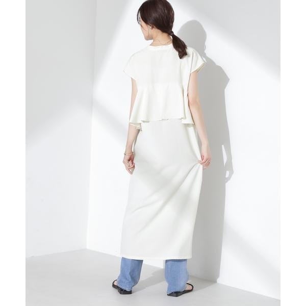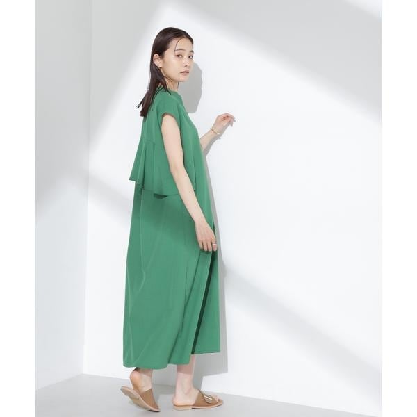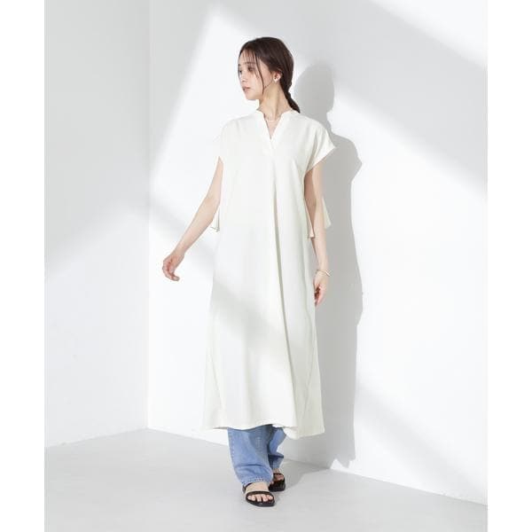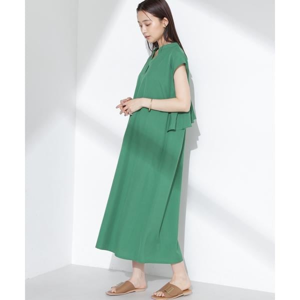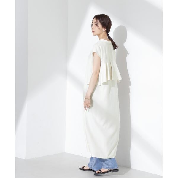 爽やかなラッフルデザインが印象的なバックシャンワンピース。肩にかかるフレンチスリーブが自然に肩や二の腕周りをカバーしてくれるデザイン。リネンのようなナチュラルな風合いで肌離れも良く、暑い季節でも快適に着て頂けます。