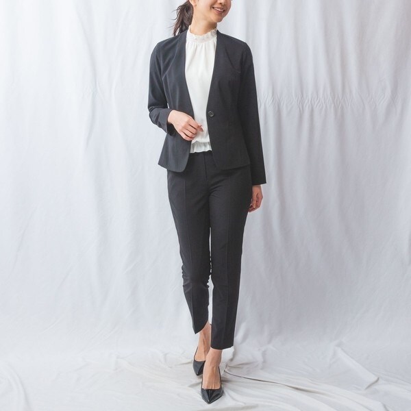 サラッとした肌触りが特徴の強撚素材を使用したジャケット。首元をすっきりとさせるノーカラーのデザインになっているため、ハイネックのトップスとレイヤードを楽しむことができます。ウエストにかけてシェイプしたようなシルエットが美しいラインを演出。同素材のボトムス(30−51−08−806、30−51−09−807)とセットアップのような着こなしがおすすめです。オフィスシーンやオケージョンにも大活躍してくれます。