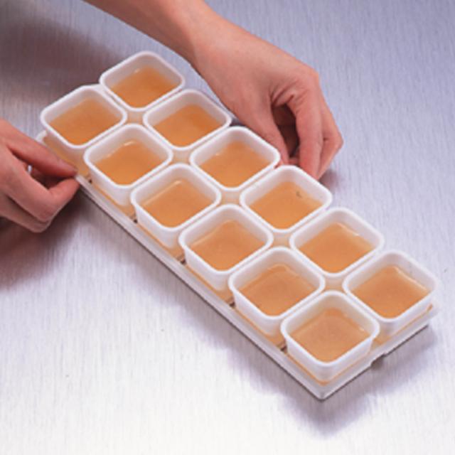 スープやソースを少量ずつフリージングしてストックするのに便利な容器です。容量はカップ1個あたり約50ml。アイスやシャーベットなどのデザート作りや、離乳食のストックにもおすすめです。