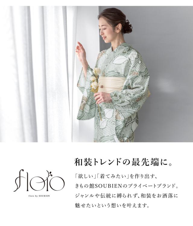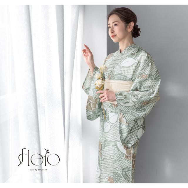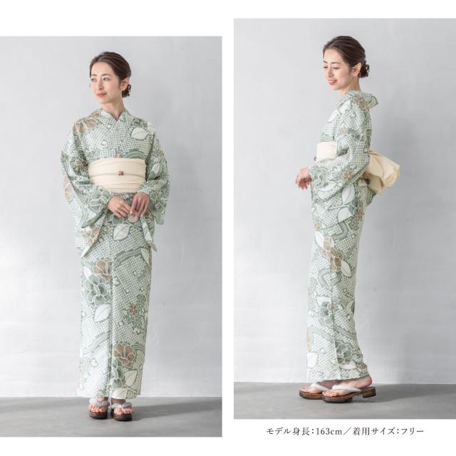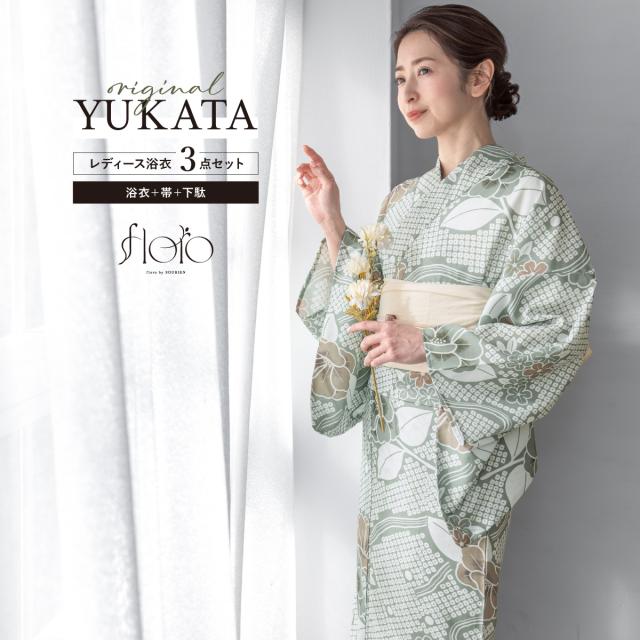 浴衣 セット レディース 浴衣セット 兵児帯 2025 floro 簡単 涼しい コーディネート済み 緑 白 牡丹 花柄 30代 40代 50代 下駄 S フリー 送料無料