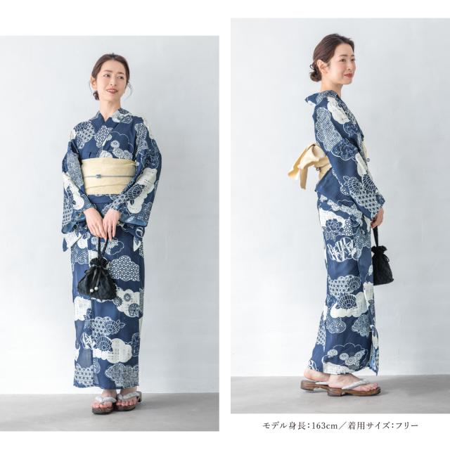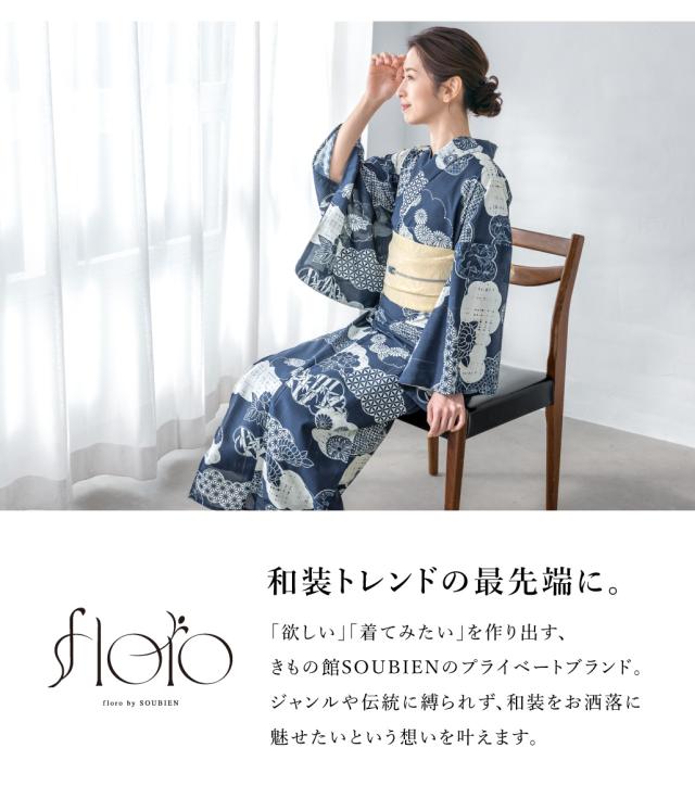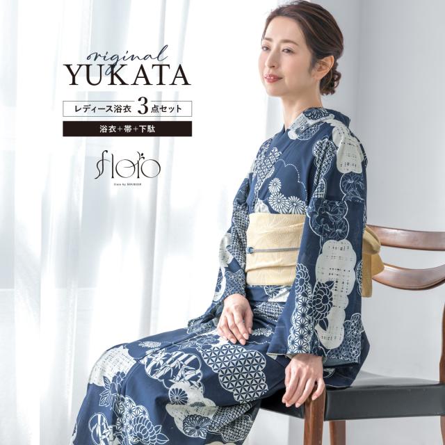 浴衣 セット レディース 浴衣セット 半幅帯 2025 floro 簡単 涼しい コーディネート済み 紺 白 クリーム レトロ 30代 40代 50代 下駄 S フリー 送料無料