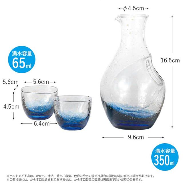 | 商品サイズ:冷酒カラフェφ45×H165・M96mm、冷酒杯φ56×D56×H45・M64mm(1個あたり) 容量:(冷酒カラフェ)約350ml、(冷酒杯)約65ml 食洗機対応:不可 電子レンジ対応:不可 |