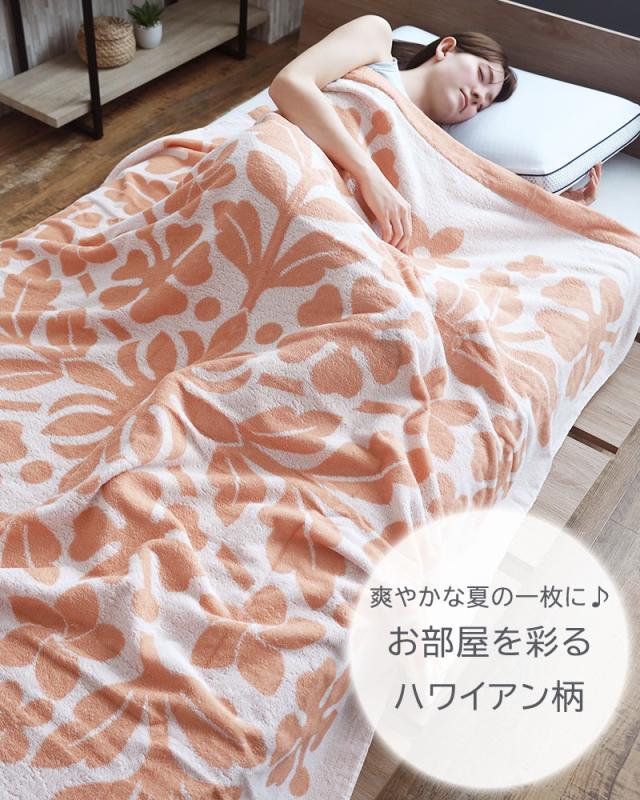 ■愛媛県今治市で作られている国産のタオルケットです。リゾート気分溢れるハワイアン柄で、お部屋を彩ります。
