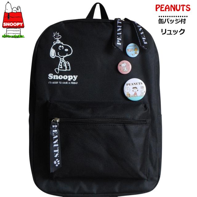 送料無料 スヌーピー リュック リュックサック A4 黒 メンズ レディース ジュニア ウッドストック 缶バッジ付き リボン付きファスナー バックパック 通学 黒 定番 ピーナッツ シンプル 部活 通勤 中学生 高校生 ブラック おまけつき ディパック かわいい 無地