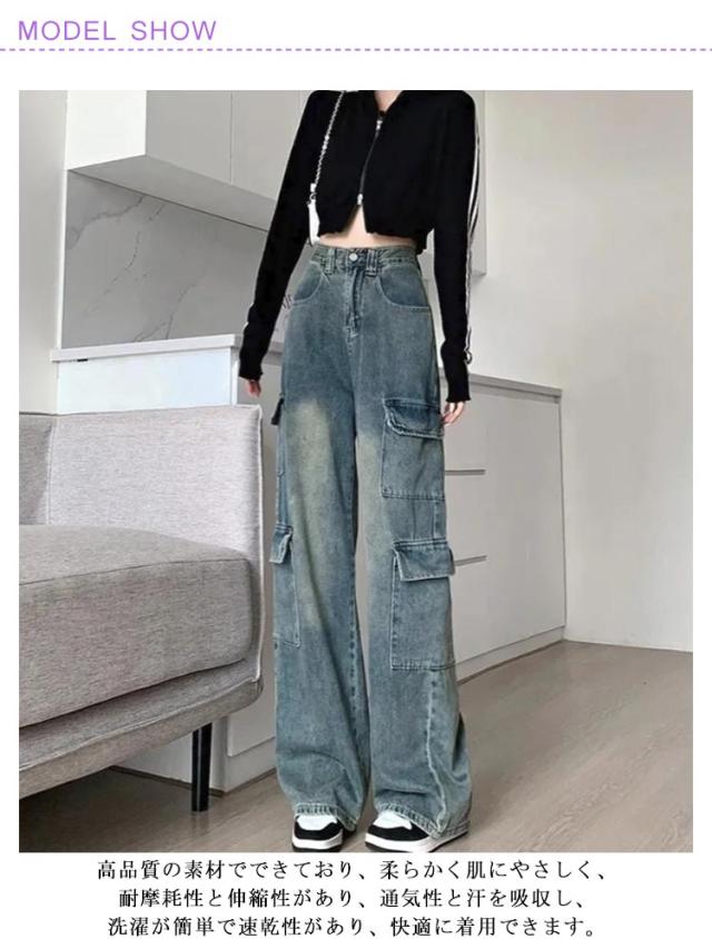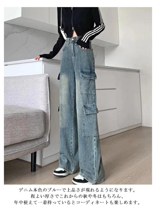 デニム カーゴパンツ ワイドパンツ ロングパンツ ダンス衣装 多ポケット ガウチョパンツ ハイウエスト ゆったり 大きいサイズ かっこいい ヒップホップ レディース ダンスパンツ 普段着 カジュアル 通勤 体型カバー XS S M L XL 送料無料