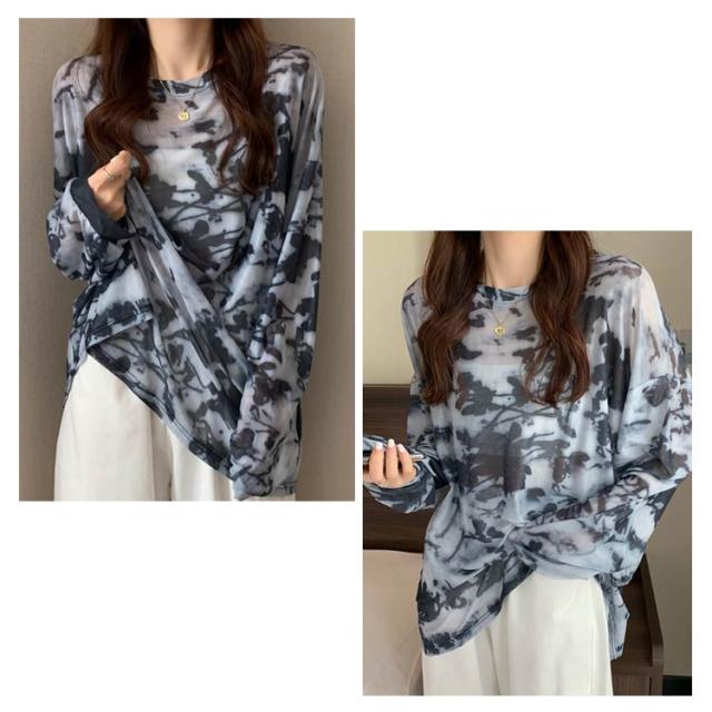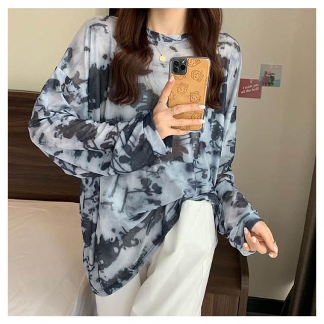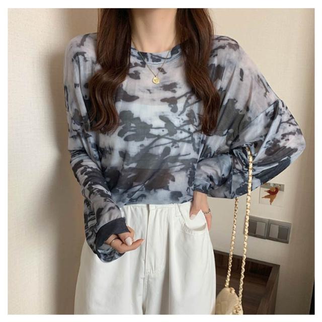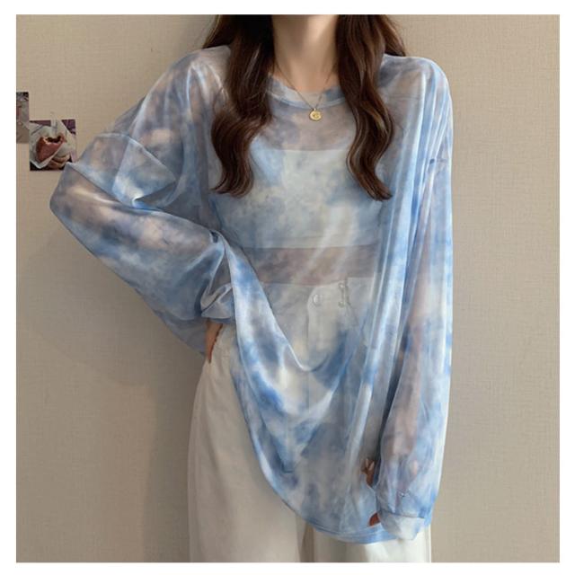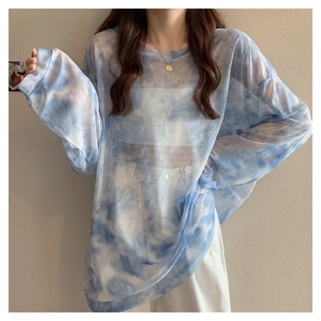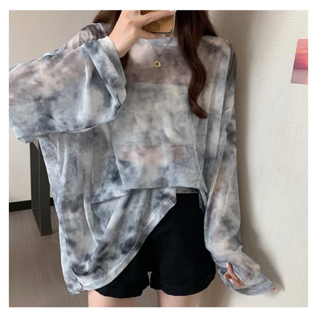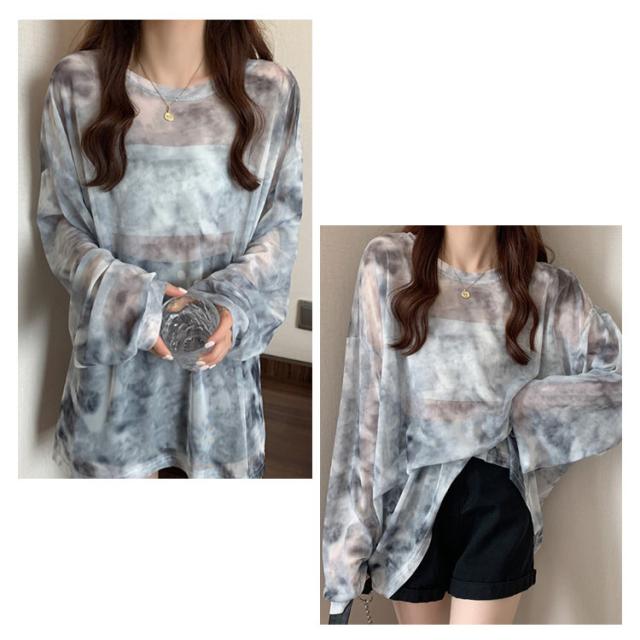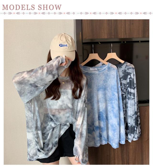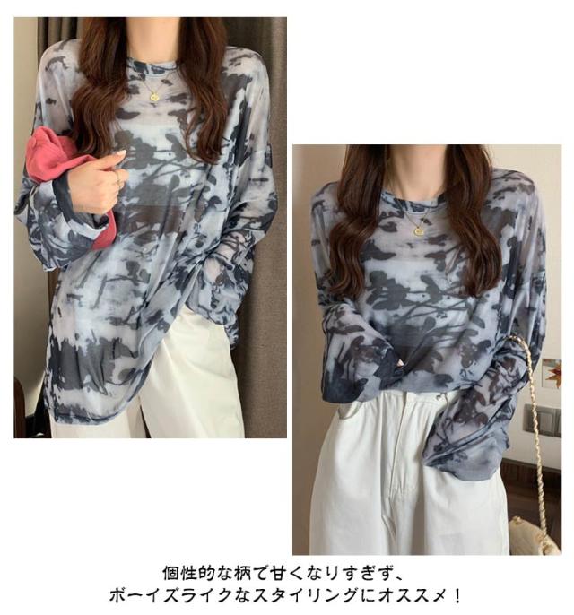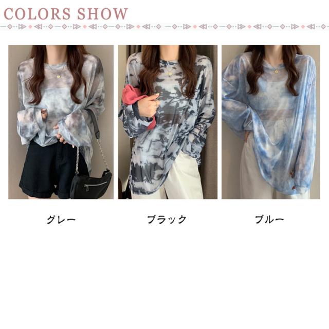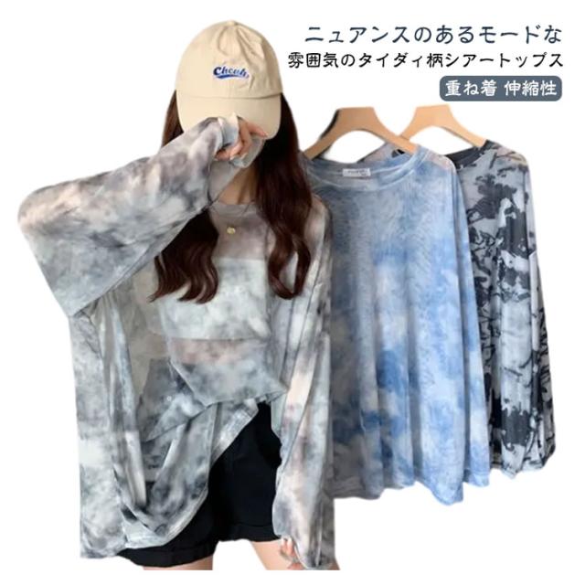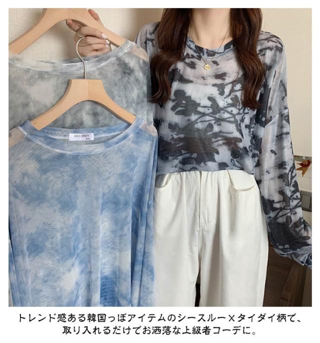 シアーシャツ 長袖 レディース シアー Tシャツ シアーインナー タイダイ柄 シアーブラウス カットソー 春夏 ロンT 薄手 薄い チュニック 透け感 大きいサイズ ビッグシルエット ラウンドネック シフォン生地 やわらかい トレンド シースルー