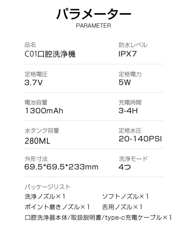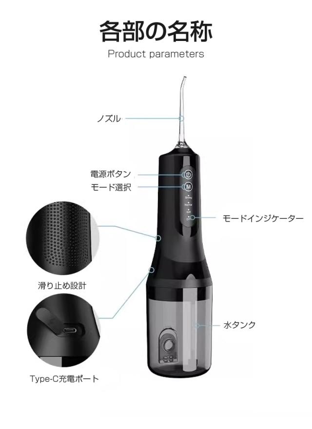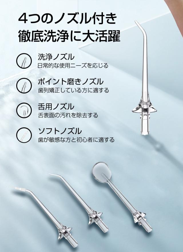 口腔洗浄器本体*1台、ノズル*4本、Type-C充電ケーブル*1本、日本語取扱説明書*1冊。
