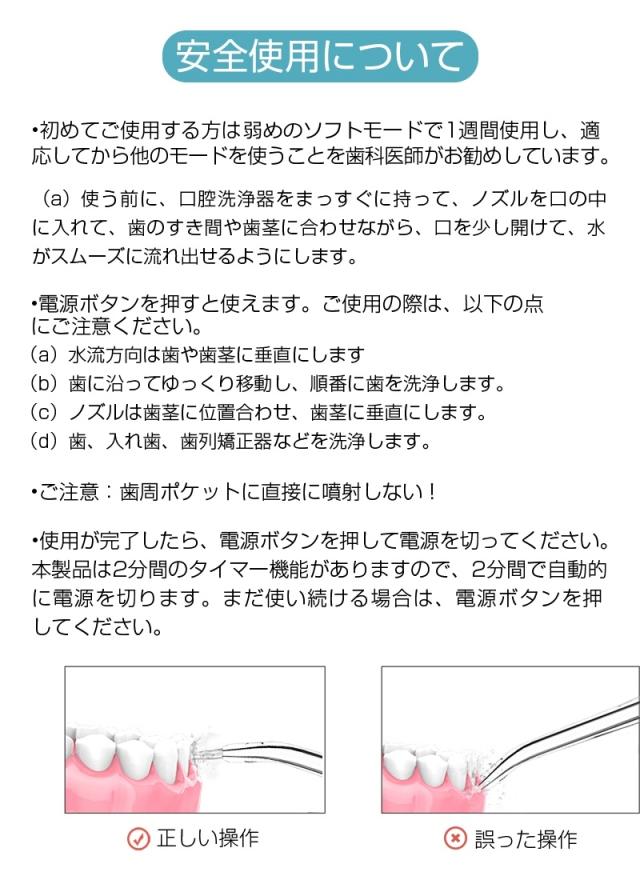 - 噴射力が大変強いので、歯の間から出た水が、舌を痛い程の勢いです。 一番弱いボタンでこのような商品です。 強力タイプが欲しい方用ですね。