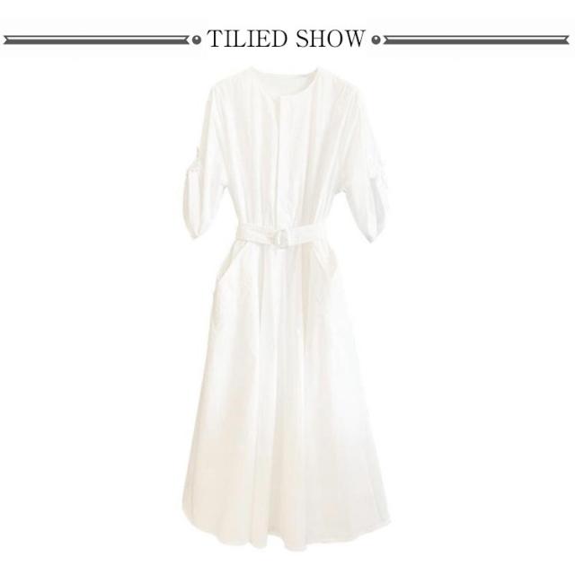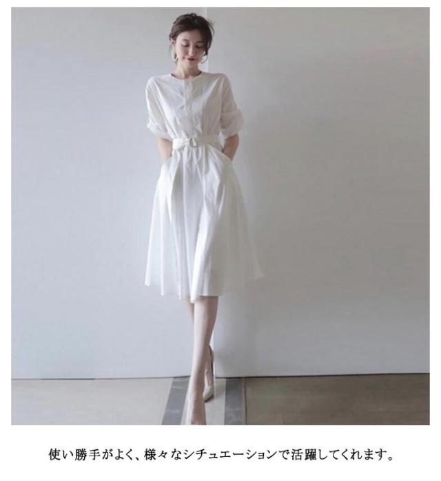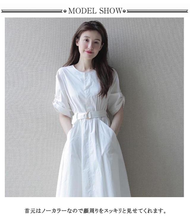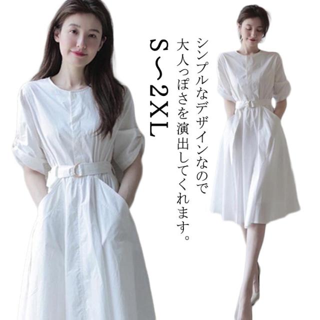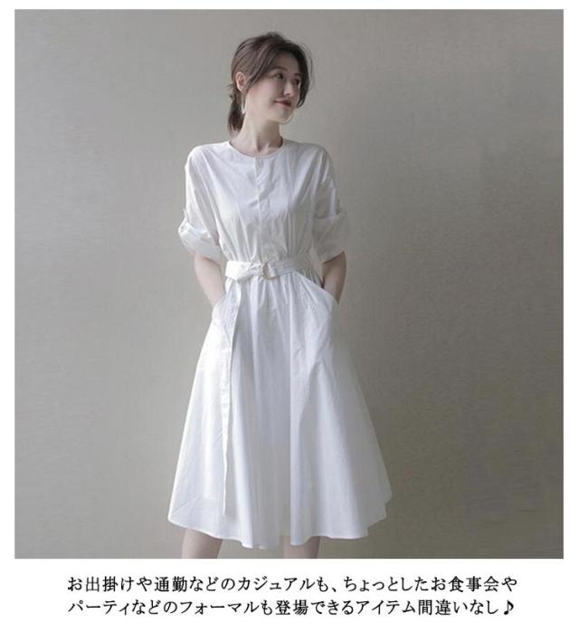 きれいめ 膝丈 ホワイトワンピース 体型カバー シャツワンピース ひざ丈ワンピース レディース ホワイト 白 7分袖 フレア 着?せ ノーカラー カジュアル ポケット付き おしゃれ 通勤 無地 Aライン 春 夏 かわいい