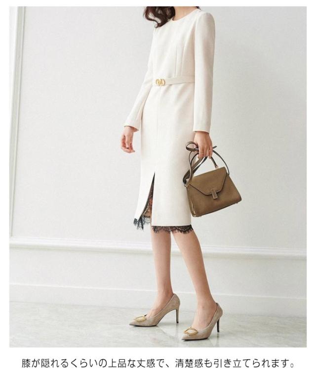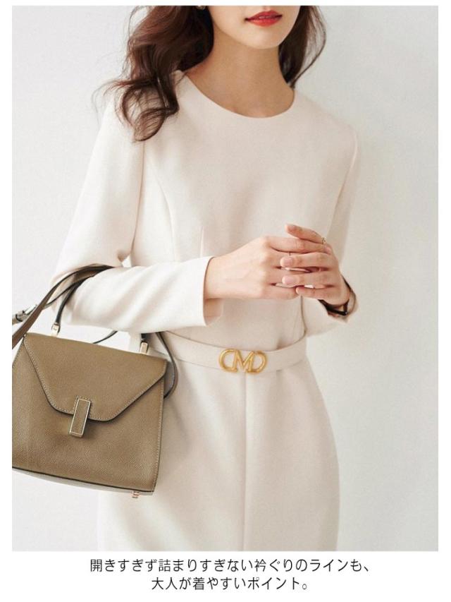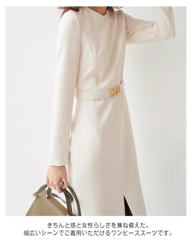 | セレモニーシーンにおすすめ。一枚で様になるフォーマルワンピース お腹周りが広がらずすっきりしたシルエットでスタイルよく見えます 開きすぎず詰まりすぎない衿ぐりのラインも、大人が着やすいポイント。 膝が隠れるくらいの上品な丈感で、清楚感も引き立てられます。 きちんと感と女性らしさを兼ね備えた、幅広いシーンでご着用いただけるワンピーススーツです。 | |
