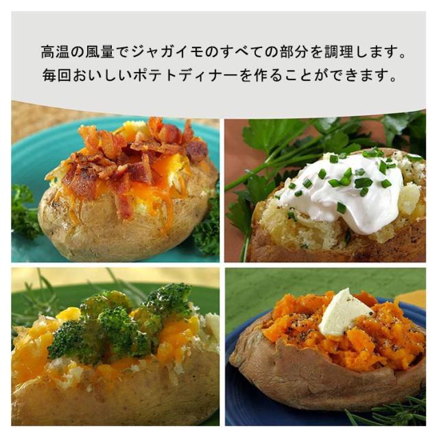 | 食べたいときに電子レンジでホクホク焼きいも! 上部のスチームバルブと底部の隆起により、ジャガイモを高温で調理するスチームサイクルを作り出し、より均一に加熱されます。 高温の風量でジャガイモのすべての部分を調理します。毎回おいしいポテトディナーを作ることができます。 美味しい石焼き芋をレンジで調理できるので、ご家庭で手軽に焼き芋を楽しむことができます。 じゃがいもやにんにく、とうもろこしなど焼き野菜にもおすすめです。 | |