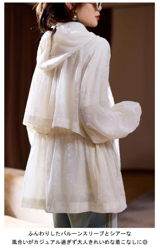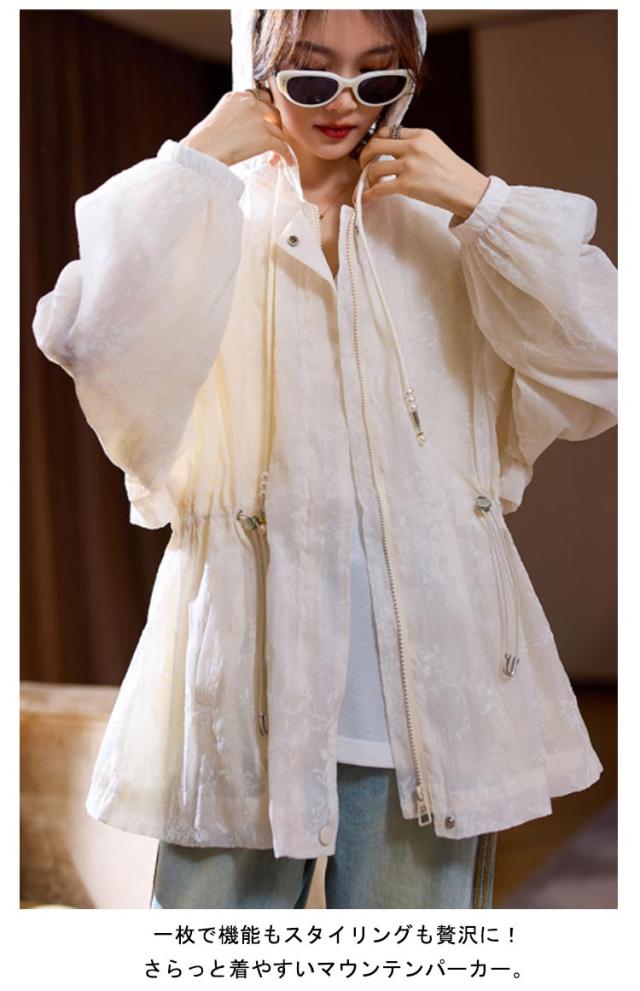 | 一枚で機能もスタイリングも贅沢に!さらっと着やすいマウンテンパーカー。 ふんわりしたバルーンスリーブとシアーな風合いがカジュアル過ぎず大人きれいめな着こなしに◎ 透け感のあるレースが程よい肌見せを叶えてくれて、程よく露出対策にもなるので嬉しいカタチ。 少し伸縮性もあるので動きやすくキゴコチもバッチリ♪フード付きなのも便利で嬉しいですね。 薄く軽量なので持ち運びにも便利♪春夏のUV対策や肌寒い時にさっと羽織りやすいライトアウターです◎ | |