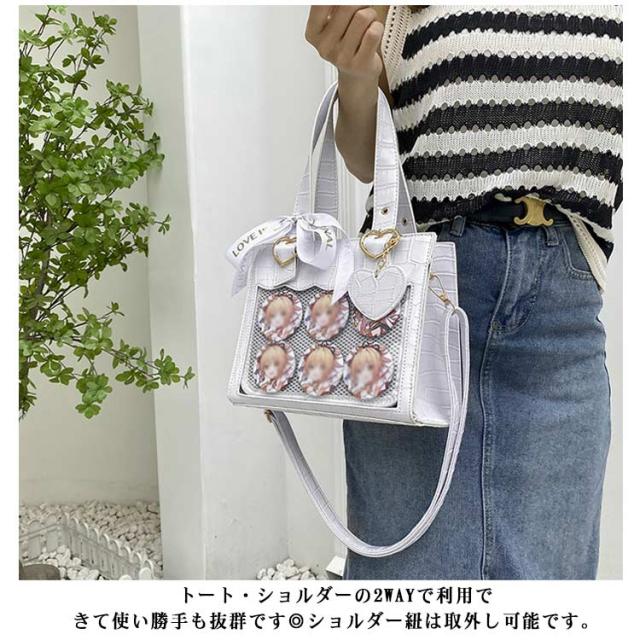| 普段使いしやすいデザインなので、痛バ初心者さんにもおすすめです! レザー調の素材を使っており、可愛さに上品さをプラス☆ 前の透明カバーに飾り板が入っていて、自分の好きな小物を入れることができるます。 トート・ショルダーの2WAYで利用できて使い勝手も抜群です◎ショルダー紐は取外し可能です。 容量が大きく、散在するさまざまな小物を簡単に分類できます。 好きな芸能人や、アニメの写真 、缶バッジ、ストラップ、キーホルダーなどを入れるだけで、簡単に世界で1つたったのオリジナルバッグの完成です。 通学、通勤、出張、ショッピング、散歩、お買い物、旅行、お出かけ、ディリー、ピクニックなど いろいろな場合では大活躍です! | |