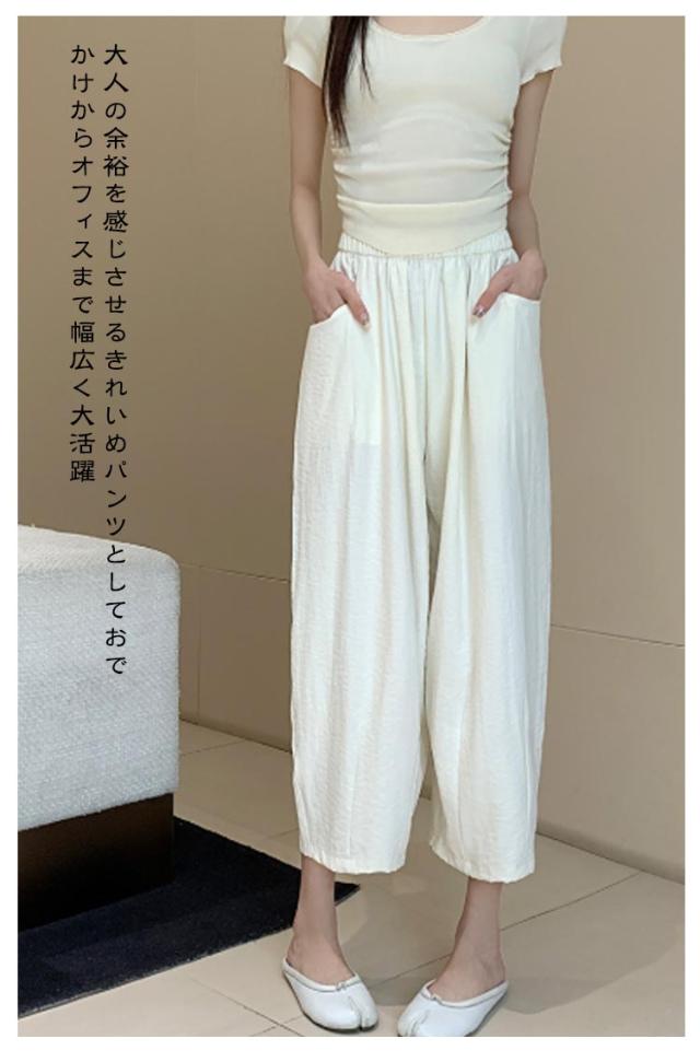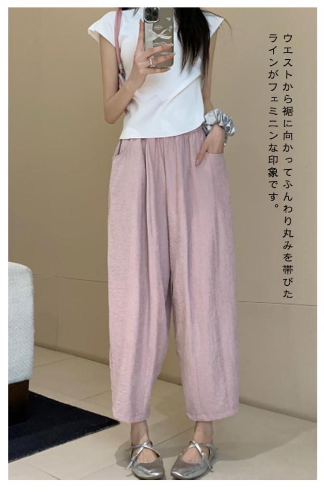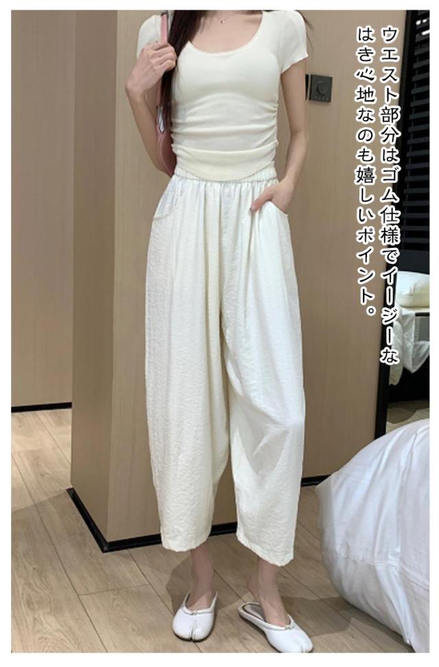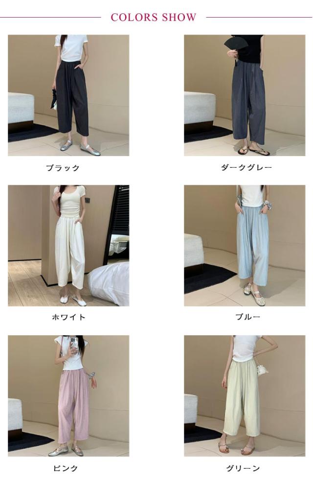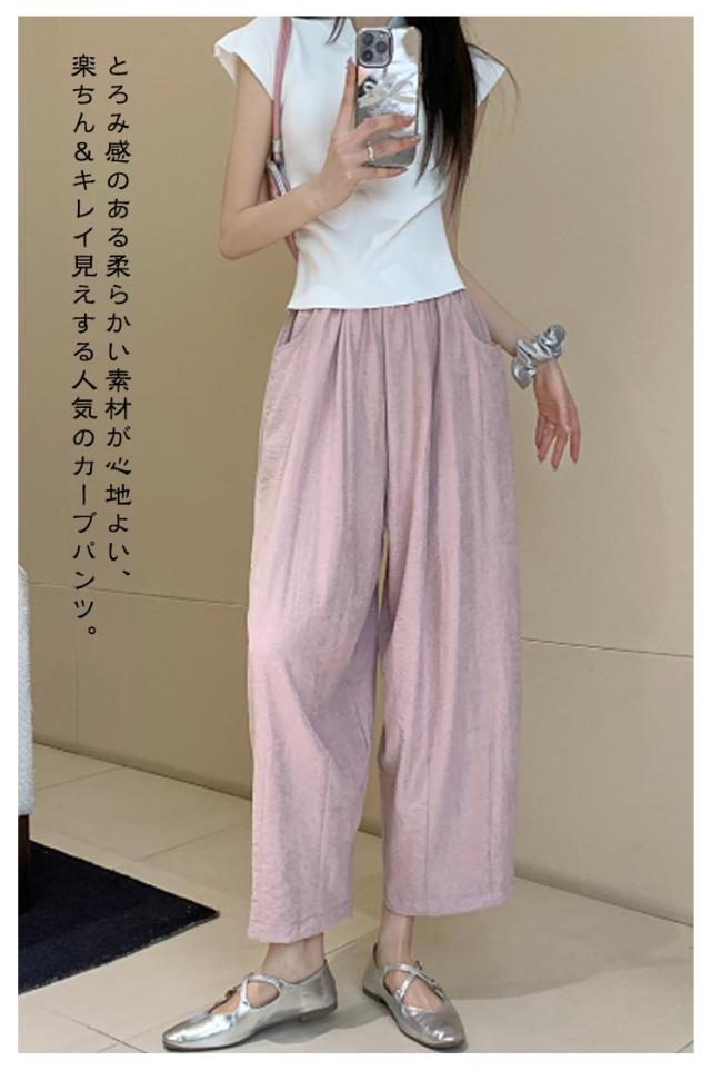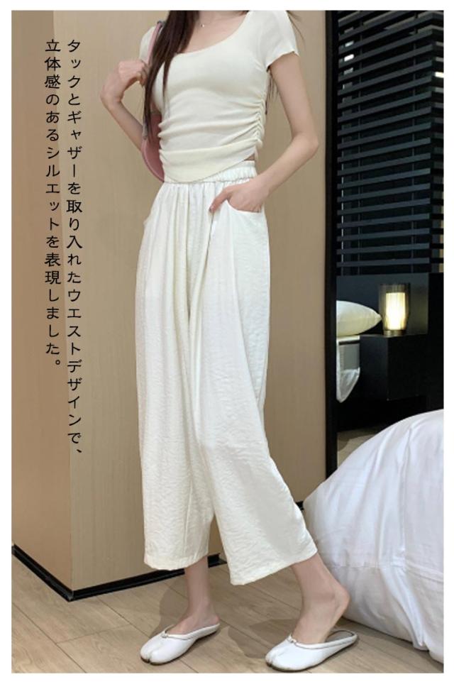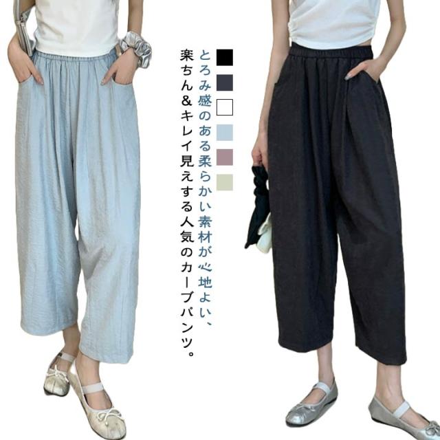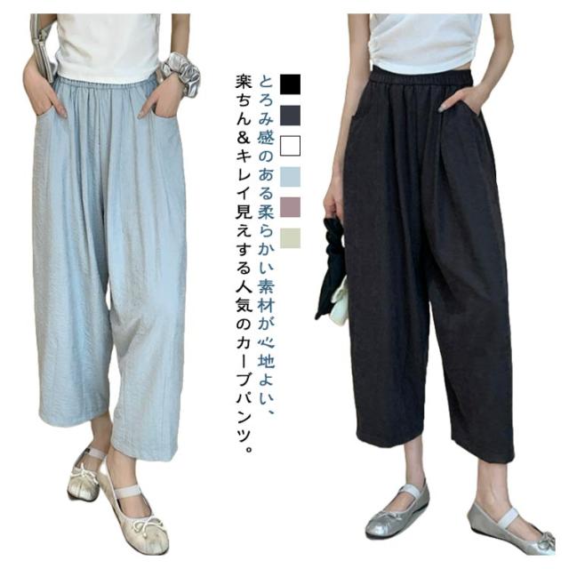 ゆったり 低身長 カーブ タック入り 9分丈 美脚 ギャザー入り ワイドパンツ カーブパンツ レディース ボトムス 体型カバー 接触冷感 ゴムウエスト カーブパンツ 涼しい 薄手 春 夏 ロングパンツ ワイド ズボン とろみ 落ち感 おしゃれ 無地 シンプル