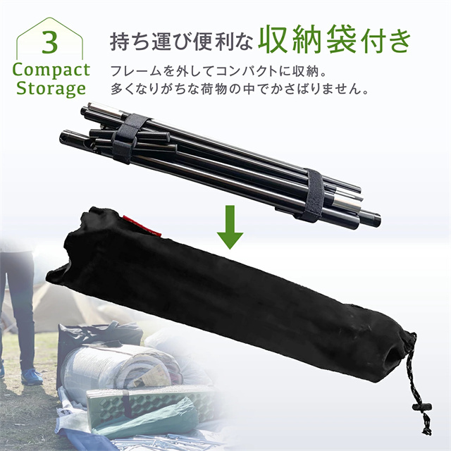 | 特徴 | 【組み立て簡単】フレームをつなげるだけのシンプル構造なので、手早く組み立てができます。 【優れた素材】アルミ素材を使用しています。これは水や汚れに強い素材なので安心して使用できます。 【持ち運びラクラク】専用の収納ポーチがあるので、持ち運びが簡単です。フレームを外してコンパクトに収納できるので、多くなりがちな荷物の中でかさばりません。 |