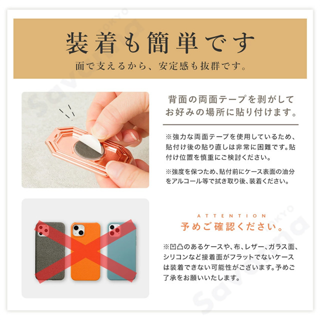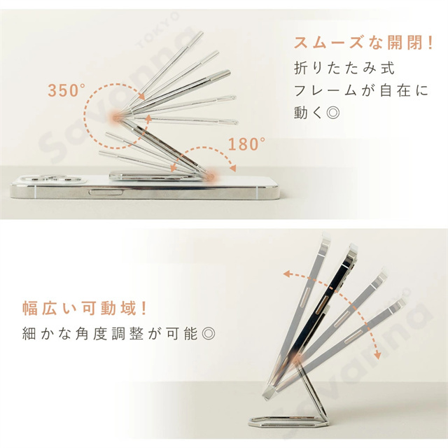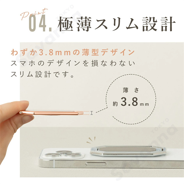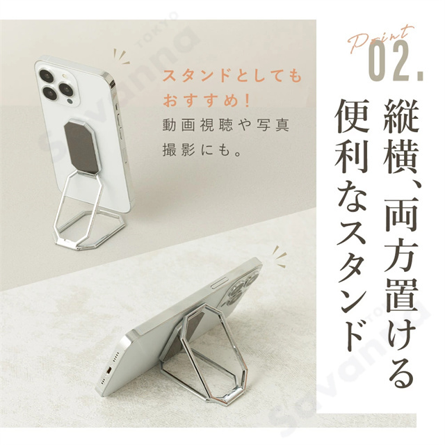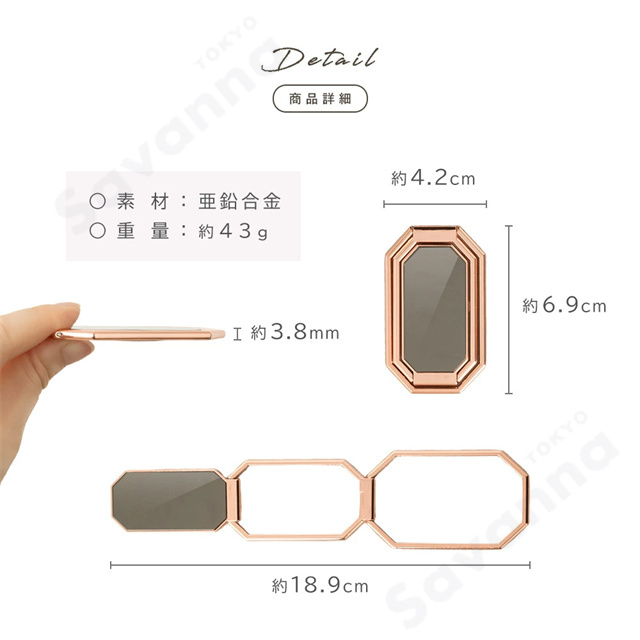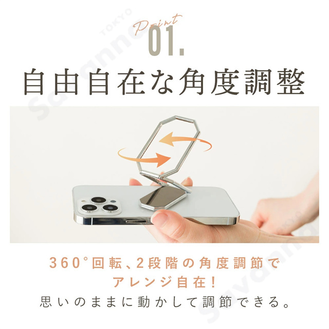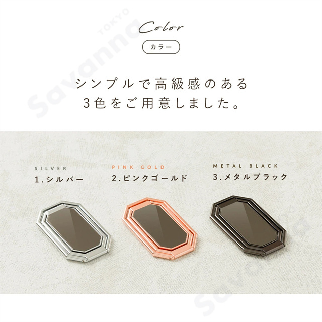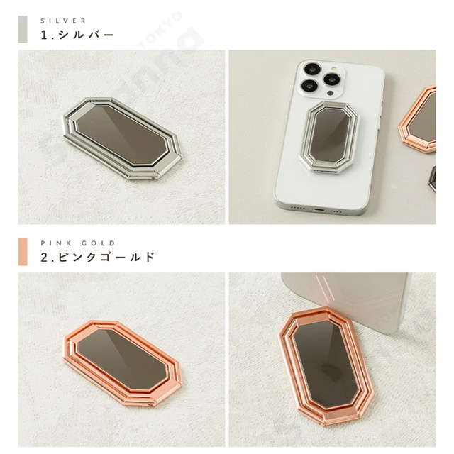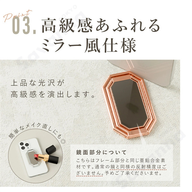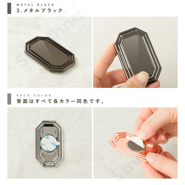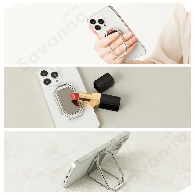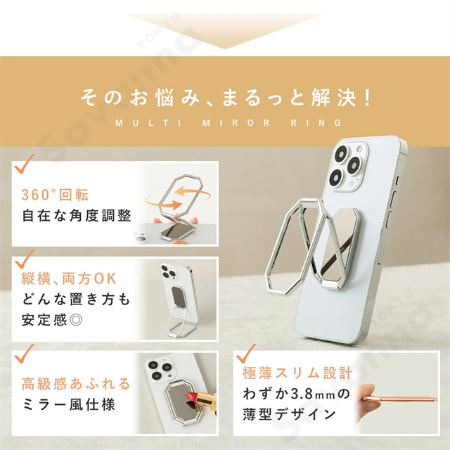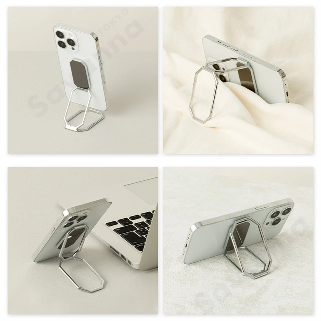 | 紹介 | 360°回転・極薄スリム設計 たて・よこ、両方置けるスタンドとしてもおすすめの多機能スマホリングです。 ・自由自在な角度調整 ・縦横、両方置ける便利なスタンド ・高級感あふれるミラー風仕様 ・極薄スリム設計 ・自由自在な角度調整 360°回転、2段階調節でアレンジ自在! 思いのままに動かして調節できます。 折りたたみ式フレームが自在に動き、幅広い可動域で細かな角度調整が可能◎ ・縦横、両方置ける便利なスタンド 動画視聴や写真撮影にもおすすめ! ・高級感あふれるミラー風仕様 簡単なメイク直しもできちゃうミラー風仕様。 上品な光沢が高級感を演出します。 ※鏡面部分について こちらはフレーム部分と同じ亜鉛合金素材です。 通常の鏡と同様の反射精度はございません。 予めご了承くださいませ。 ・極薄スリム設計 わずか3.8mmの薄型デザイン! スマホのデザインを損なわない設計です。 |