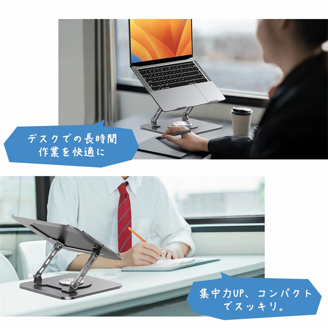 | 商品説明 | 【360度回転&角度調整自由】 360度回転&無段階角度調整が可能! Z型デザインで細かい調整ができるので、最適な視線角度をキープ。 会議や勉強時に、スタンドを動かさずに画面共有もスムーズ! 【耐荷重10kg・優れた放熱性】 頑丈な両足構造で、最大10kgのデバイスも安定サポート! 熱伝導率の高いアルミ合金と通風穴設計で、放熱性も抜群。 タイピング時の振動も抑え、快適な作業環境を実現。 【高さ自由調節&姿勢改善】 3cm〜27cmまで無段階調節可能! 目線を適切な高さにすることで、猫背・肩こり・腰痛を軽減。 人間工学に基づいた設計で、長時間の作業も快適! 【折りたたみ&滑り止め設計】 折りたたみ式でコンパクト収納&持ち運びに便利! 設置面やフック内側など、計10個の滑り止めシリコンパッドを搭載。 大切なノートPCをしっかり守り、傷やズレを防止! 【幅広い対応機種&収納スペース】 Macbook / Surface / HP / iPad Proなど、11〜17インチのノートPC&タブレット対応! スタンド下のスペースを活用し、キーボードやアクセサリーをスッキリ収納可能。 滑らかなアルミ仕上げで、高級感のある手触り! |