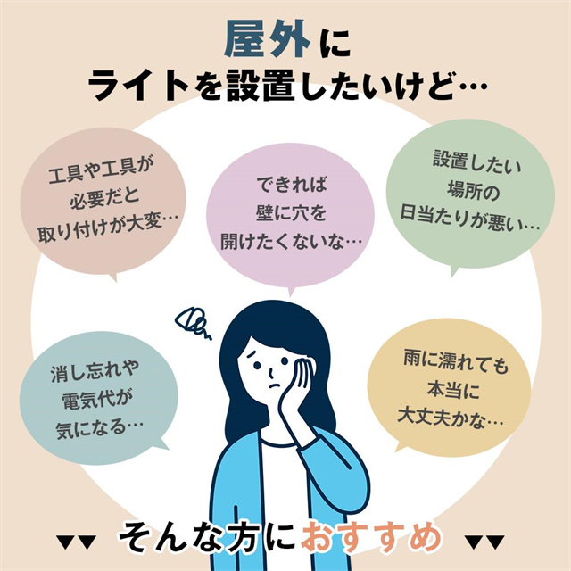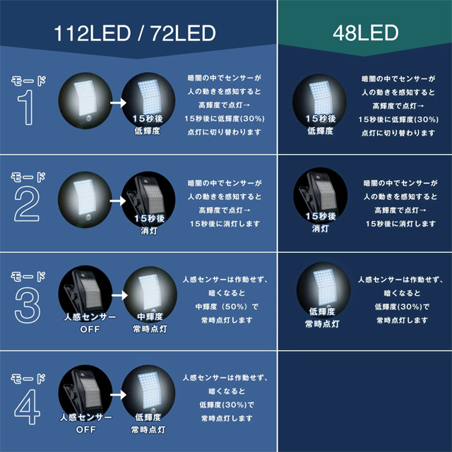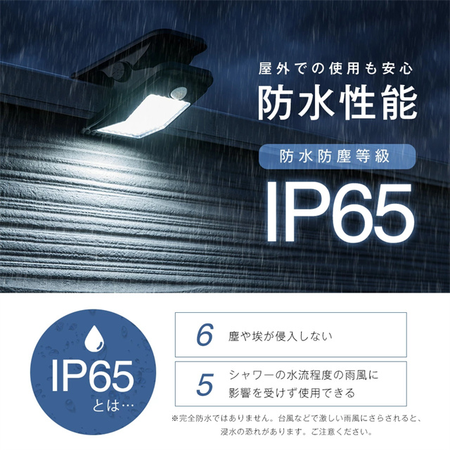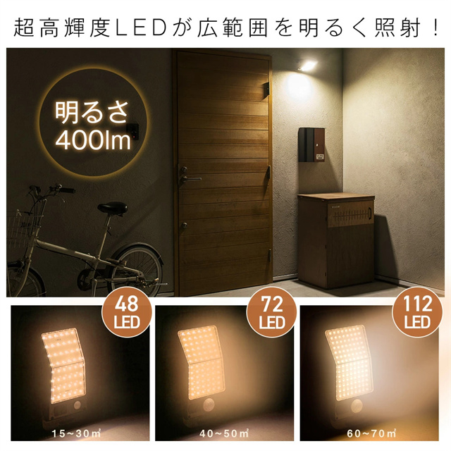 | 商品説明 | 【オススメポイント】 ・工事不要!どこでも簡単設置&配線不要 ・最大10時間点灯する超高輝度LED搭載 ・防犯・照明どちらにも最適 ・雨の日も安心のIP65防水仕様 【主な特徴】 4WAY設置 ・クリップ ・吊り下げ ・置き型 ・ネジ固定 ・2WAY充電 (ソーラー + USB) 【種類】 48LED / 72LED / 112LED 【カラー】 ホワイトライト、オレンジライト 【サイズ】 幅10×奥行19×高さ10.5cm (112LEDモデル) 【素材】 ABS + PS 【使用用途】 庭・ベランダ・キャンプ・作業灯・防犯など |
