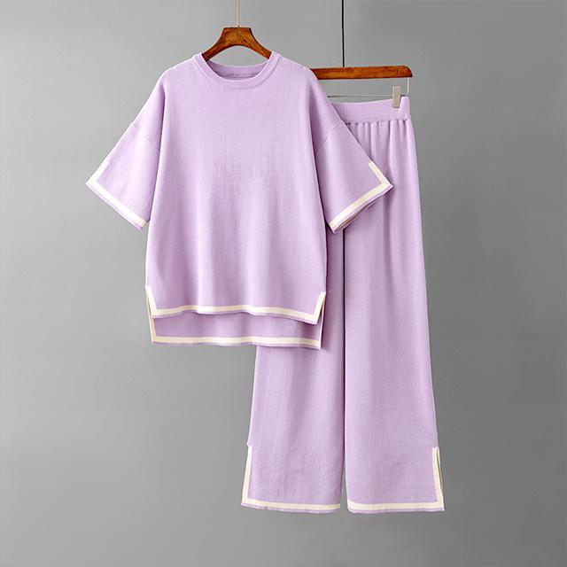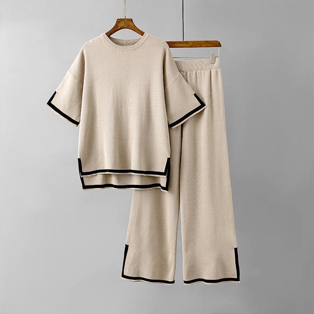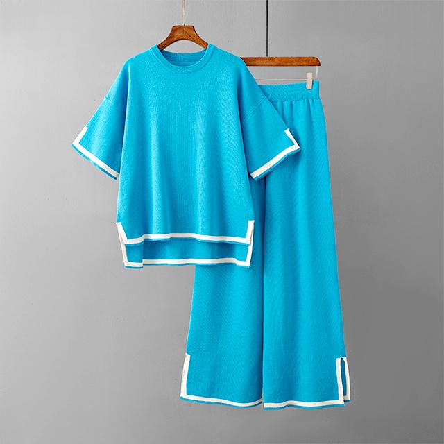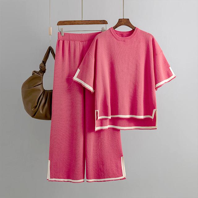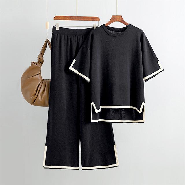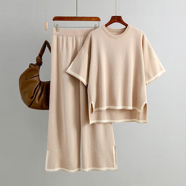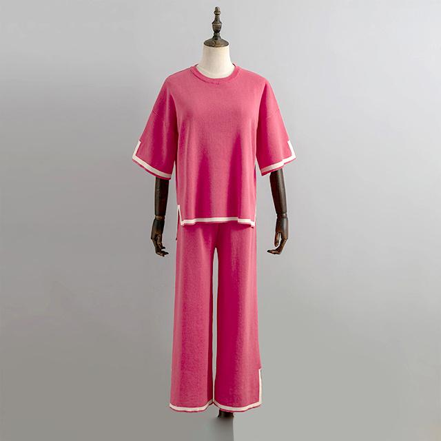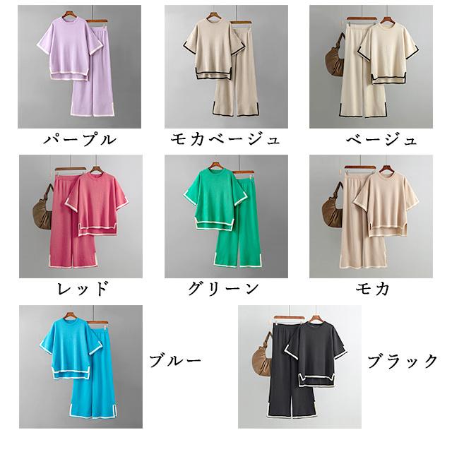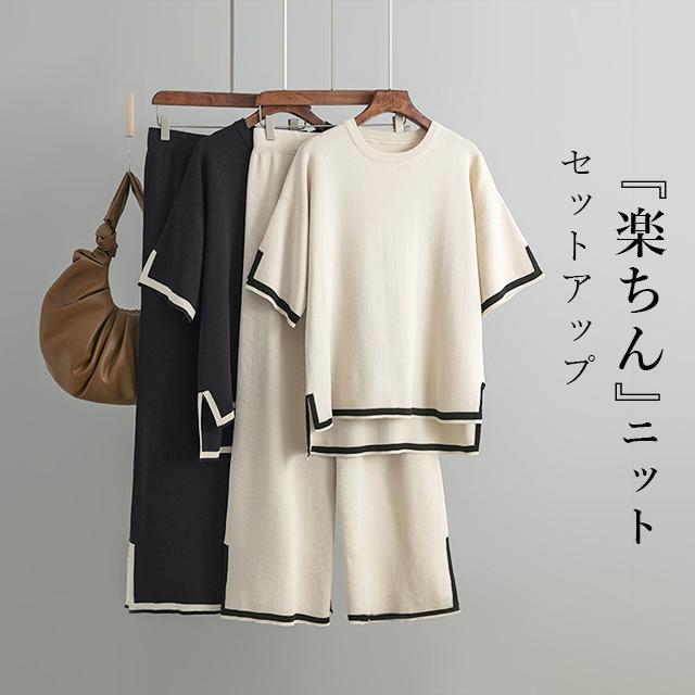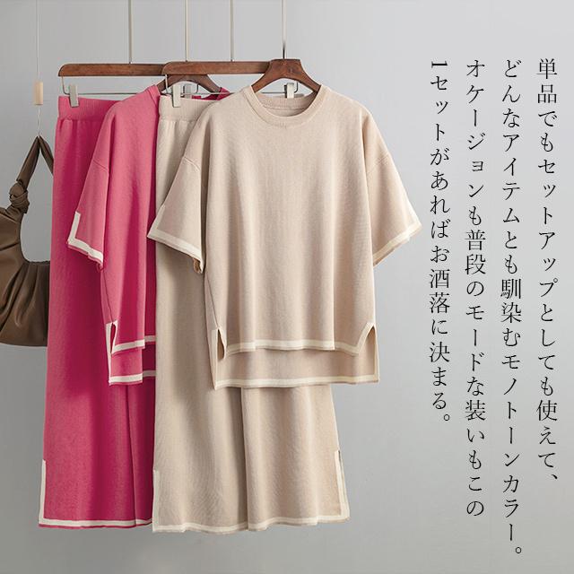 レディース セットアップ ニットセットアップ 着回し トップス パンツ ハイゲージニット サイドスリット フレンチスリーブ 半袖 配色 バイカラー グレージュ ブラック ウエストオールゴム 8分丈 シンプル 黒 プルオーバー ボートネック ボトムス ズボン ワイドパンツ ワイド 長ズボン ウエスト ゆったり 体型カバー お尻 隠れる 楽ちん 楽チン おうち時間 ウェア ワンマイル リラックスウェア リラックス リラクシーウェア リラクシー ナイトウェア 外出 伸縮性 伸縮 ストレッチ性 ストレッチ 上下セット セット 無地 カジュアル ナチュラル おしゃれ オシャレ きれいめ キレイめ 上品 送料無料 30代 40代 50代