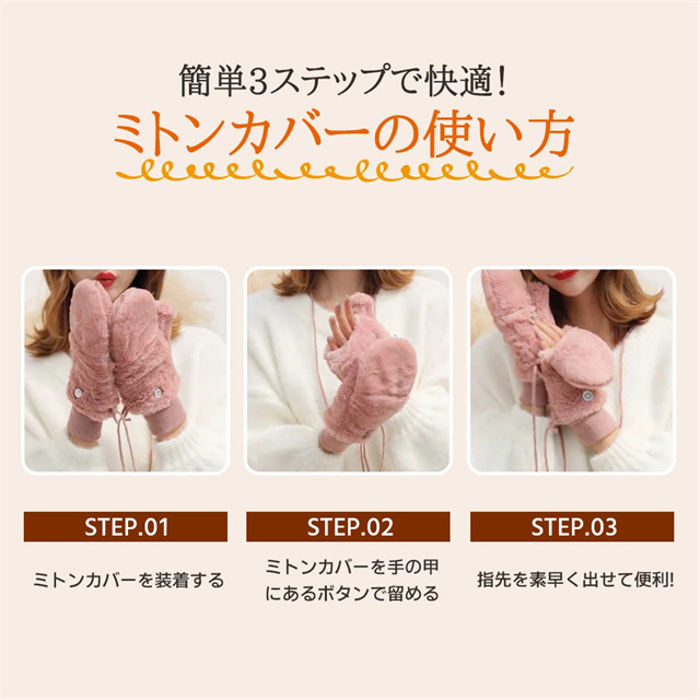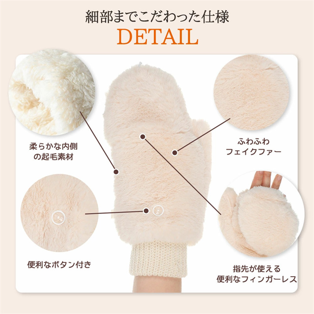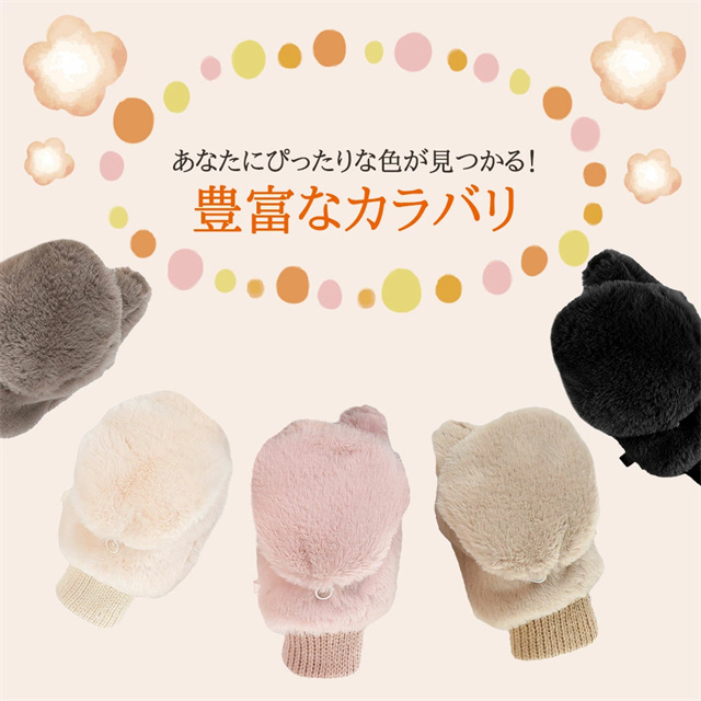 | ポイント | 【スマート2WAY設計】 ミトン手袋とフィンガーレスグローブの2way仕様、ボタン固定で素早く切り替え可能 【高機能性と実用性】 スマートフォン対応、細かい作業も可能、紛失防止の取り外し可能な紐付き 【優れた保温性】 裏ボア仕様で暖かさをキープ、手首リブニット採用で冷気をシャットアウト 【上質な素材感】 ふわふわフェイクファー使用、触り心地の良い高品質素材採用 【スタイリッシュデザイン】 シンプルなワントーンカラー、丸みを帯びた可愛らしいフォルム、様々なコーディネートに対応 |