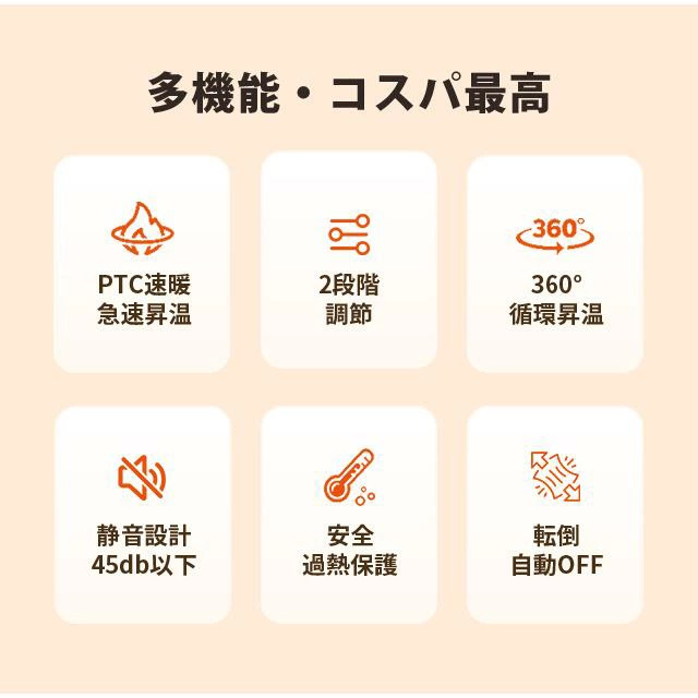 | 商品説明 | ◆この新製品には2レベルの調節スイッチを設けています。 ◆段階1は550Wの中温熱風、段階2は900Wの高温熱風で、体感温度が異なる方の需要に応じて調整することができます。 ◆ただ2秒で熱風を出し、外出の帰りでも早速、寒気を退散させ、体が早めに暖かくなることができます。 ◆電気PTCセラミックの発熱体で、直火がなし、空気にも体にも優しいです。 家のキッチン、脱衣室、寝室などの場所に思い切りに使用できる電気ストーブです。 ◆一目で操作が分かるシンプルなデザインで、各年齢層でも気軽に使えるセラミックファンヒーター。 |