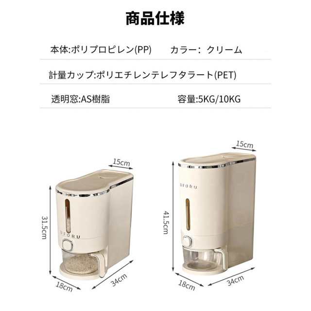| 仕様 | ◆サイズ 【5kg】 約 幅18×奥行34×高さ31.5(cm) 【10kg】 約 幅18.1×奥行34×高さ41.5(cm) ◆カラー クリーム、ミルクティー |