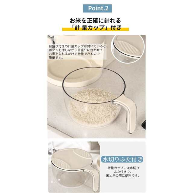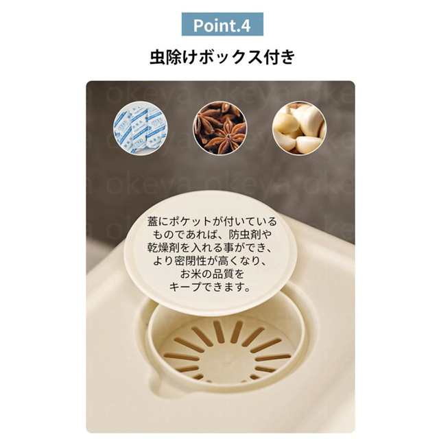 | 特徴 | 「安心素材」健康な使い方をするための厳選素材材質は食品用PPを採用し、高温に強く、より耐久性があります。 「内部傾斜設計」一粒の米が残らない 「大口径設計」より快適なお米の投入が可能です。 「開けやすい密閉蓋」シリコンシールを付き、湿気を効果的に防ぐ、十分な気密性を確保しています。 「虫除けボックス付き」スターアニス、脱酸素剤、ニンニクなどを入れて、湿気や害虫から保護します。 「プッシュボタン式」ワンタッチ自動お米取り可能です。毎回ご自由にお米の量を取ることができます。 「計量カップ付き」水切りフタ付きで洗米も簡単です。 「保存可能なもの」緑豆、小豆、粟、オーツ麦、大麦、米、大豆などを保存可能です。 |