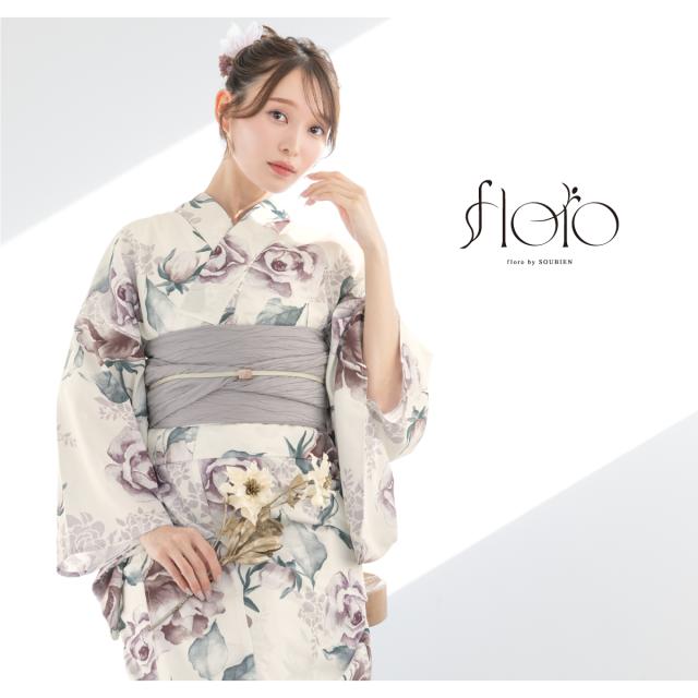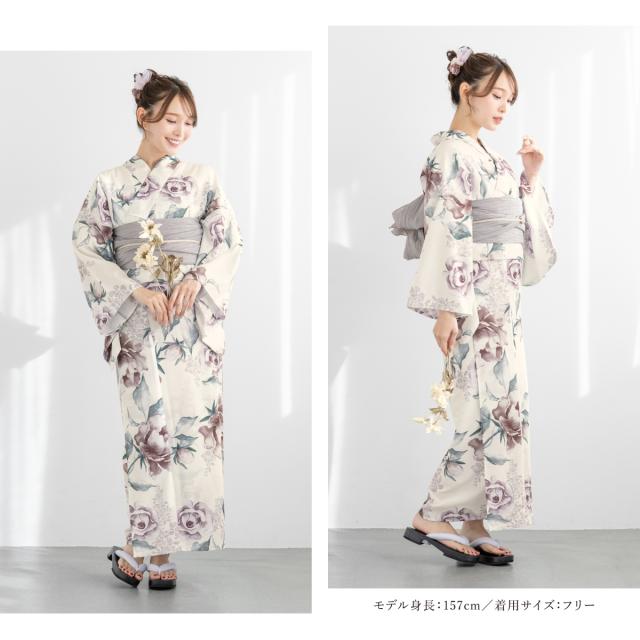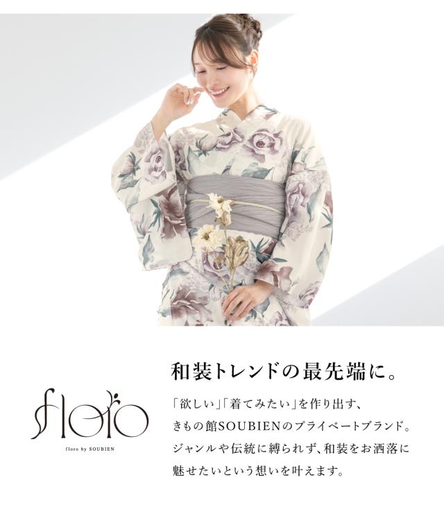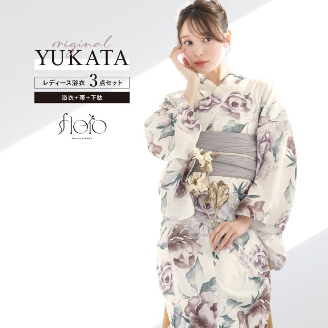 浴衣 セット レディース 浴衣セット 兵児帯 2025 floro 簡単 涼しい コーディネート済み 薄ベージュ 薄紫 グレージュ 花柄 おしゃれ 可愛い 下駄 S フリー 送料無料