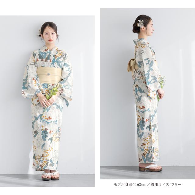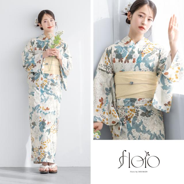 浴衣 セット レディース 浴衣セット 半幅帯 2025 floro 簡単 涼しい コーディネート済み 白 水色 クリーム 花柄 モダン おしゃれ 可愛い 下駄 S フリー 送料無料