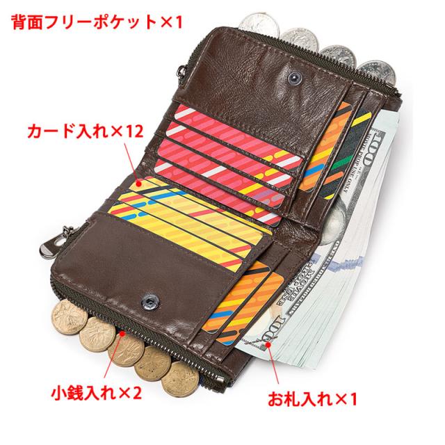 お札入れ×1 カード入れ×12 小銭入れ×2 背面フリーポケット×1 金属チェーン付き(盗難防止) |