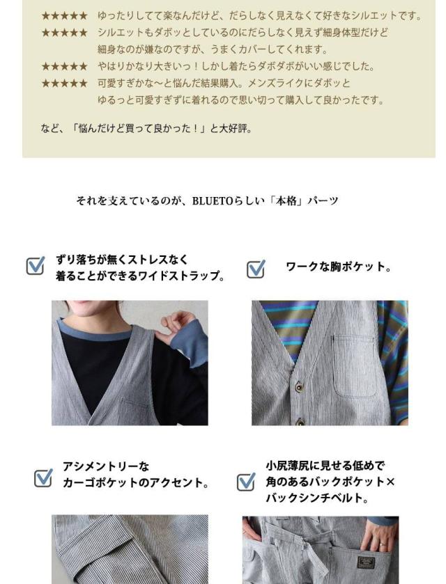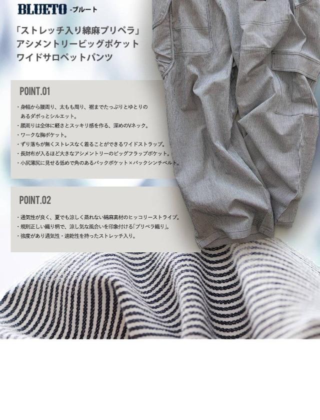 綿麻 サロペット ゆったり 着痩せ レディース 涼しい 伸びる ストレッチ しっかり 丈夫 おしゃれ 春 夏 重ね着 大人 カジュアル アメカジ サロペットパンツ オーバーオール アシンメトリー ビッグポケット パティ BLUETO ブルート
