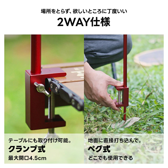 | 商品説明 | 3段階で高さ調節可能なランタンスタンド☆ ■キャンプ、BBQ、レジャーなどあらゆる場面で役立ちます ■ポールの本数で61cm、91cm、124cmの3段階に高さ調節が可能◎ ■クランプ式・ペグ式の2way仕様で場面に合わせてご使用いただけます ■収納袋付きで持ち運びも楽々♪ ■ポールをつなげて固定するだけの簡単取り付け◎ |