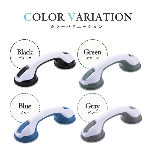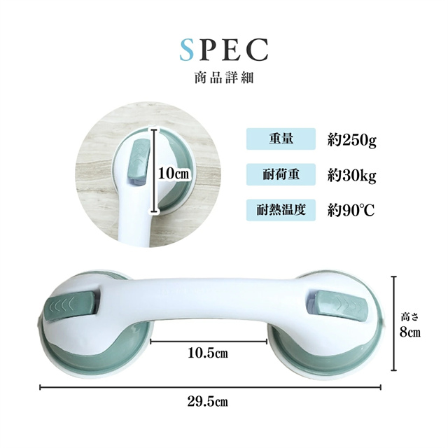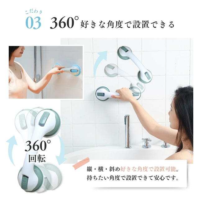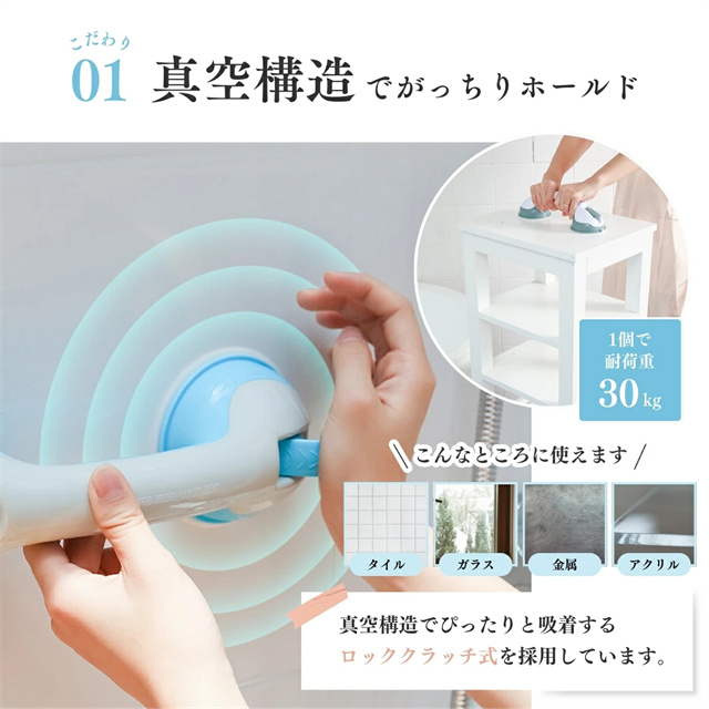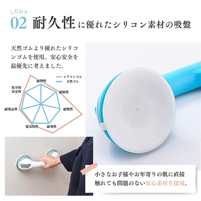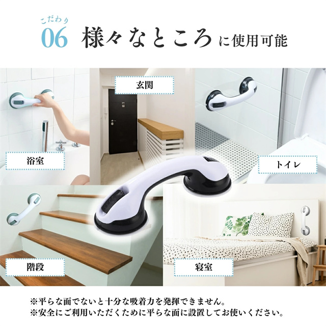 | こだわりポイント | ◆真空構造でがっちりホールド 真空構造でぴったりと吸着するロッククラッチ式を採用 (耐荷重 30 kg) ◆耐久性に優れたシリコン素材の吸盤 天然ゴムより優れたシリコンゴムを使用 肌にやさしい安心素材 ◆360°好きな角度で設置できる 縦・横・斜め好きな角度で設置可能 持ちたい角度で設置できて安心 ◆耐熱耐冷で水にも強い 耐熱性・耐寒性に優れており お風呂や 洗面所、夏場の玄関にも装着可能 ◆工事不要の簡単設置 ‐装着方法- 1.設置したい場所の汚れや水分を きれいに拭き取ります。 2.脱着状態で設置したい場所の上に セットします。 3.両端をセットできたら吸着状態に してロックします。 4.しっかり固定できていることが 確認できたら取付け完了です。 ◆様々なところに使用可能 玄関 トイレ 階段 寝室 ※平らな面でないと十分な吸着力を発揮できません。 安全にご利用いただくために平らな面に設置してお使いください。 |