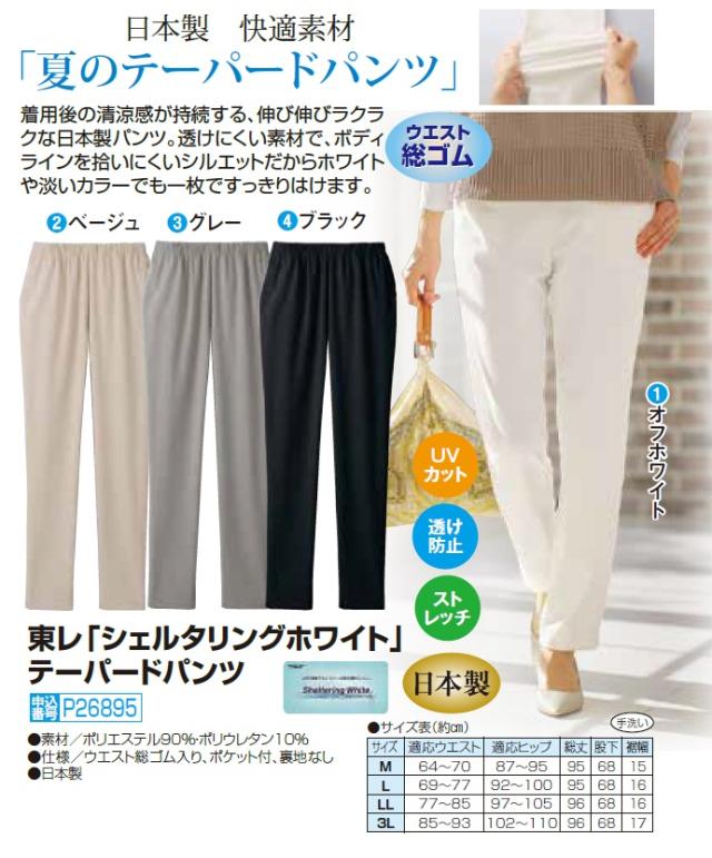 日本製 東レ シェルタリングホワイト テーパードパンツ 全4色 ストレッチパンツ ズボン 快適素材 レディース 婦人服 ミセス シニア 女性 UVカット 紫外線 日焼け 対策 ホワイト ベージュ グレー ブラック 白 薄茶色 灰色 黒 無地 シンプル シニアファッション 40代 50代 60代 70代 80代 90代 母の日 お母さん おばあちゃん 春物 夏物 春夏