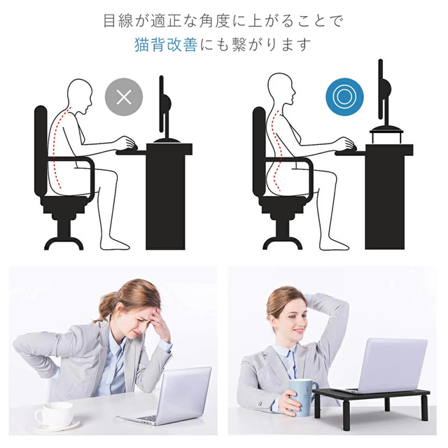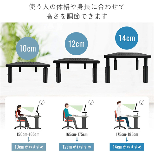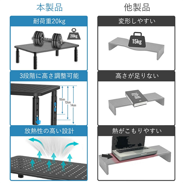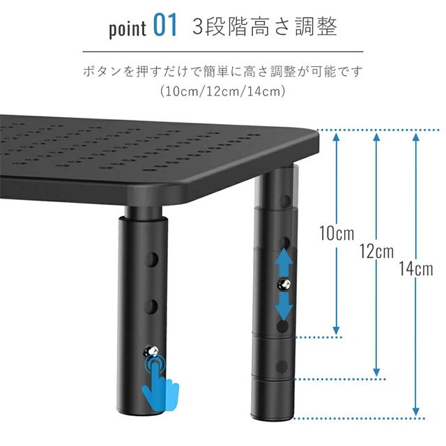 | 特徴 | ■頑丈なスチール製 丈夫で高品質のスチール素材を使用し耐久性抜群。 ■3段階高さ調整 ボタンを押すだけで高さが調節できます。 モニター台の高さを自分の体格に合わせて10cmから12cm、14cmまで調整することができます。 ■放熱性が良い たくさんの穴が空いた構造で通気性・放熱性に優れているので、 ノートパソコンなどの機器を置くのにも最適です。 長期間の使用でノートパソコンの温度が上昇した場合でも、 できるだけ早く熱を放出して温度を下げることができます。 ■猫背対策 モニターを設置することで、目線の位置を上げモニターを見やすくします。 目の疲れや背中および頚椎の疲労を軽減でき、作業効率も上がります。 長時間パソコン作業する方にぴったりです。 ■多機能 モニター以外に、プリンターや電話機、FAX、本など色々なものが設置できるので シーンを選ばず多機能に使えます。 オフィス、寮 学校や研究室やリビングルームなどの場合もオススメです。 |