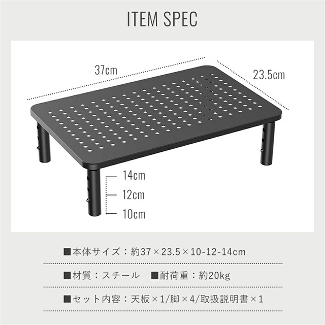 | 仕様 | ・サイズ:約37×23.5×100/120/140mm ・材質:スチール ・セット内容:天板×1/足×4 ・耐荷重:約20kg |