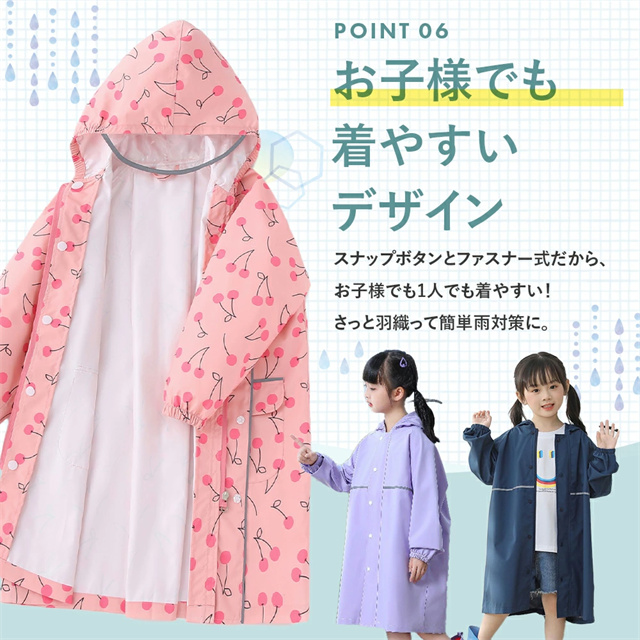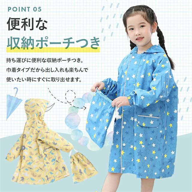 | 特徴 | ・ランドセルOK!2way仕様 後ろのスナップボタンを外せばリュックやレインコートも背負ったまま着られる! タックの広がりをボタンで変えられるからどんな時にも着用OK ・防水&防風性抜群 しっかり防水で突然の雨でも安心。 袖口にはゴムがついているから風が吹いても雨の侵入を防いでくれます。 ・暗くても安心な反射テープ 暗くて見えづらい時でも安心な反射テープつき。 目立つところについているから、お子様の居場所をしっかり反射して悪天候な日も安全度アップ! ・外が見やすいフード&バイザー 傘がさせないときや両手を空けたい時に便利なフードつき。 透明バイザーつきだから悪天候でも周りが見やすく安全に! ・収納ポーチつき 持ち運びに便利な収納ポーチつき。 巾着タイプだから出し入れも楽ちんで使いたい時にすぐに取り出せます。 ・お子様でも着やすいデザイン スナップボタンとファスナー式だからお子様でも着やすい! さっと羽織って簡単雨対策に。 ・選べる可愛いデザイン 雨の日も楽しく過ごせるかわいいデザイン! お子様の好みにあわせてお選びいただけます。 |