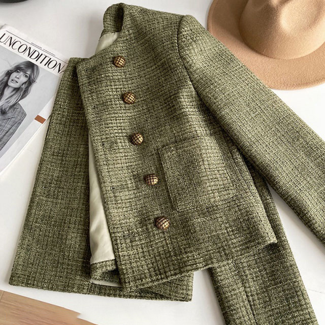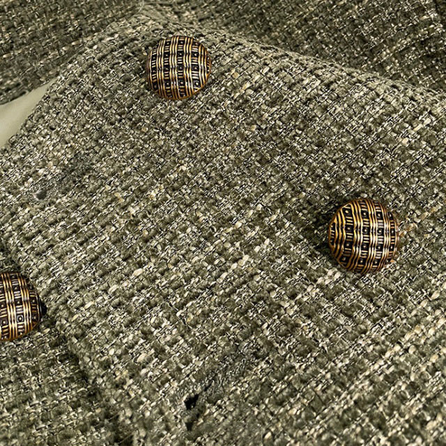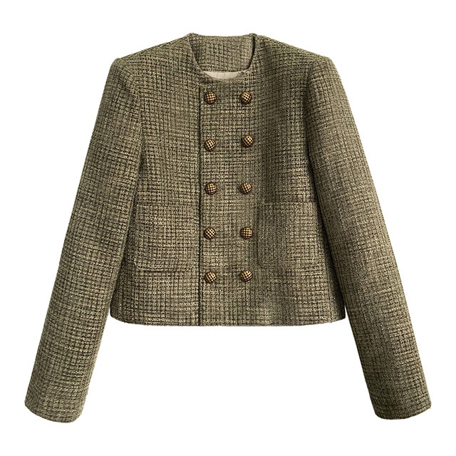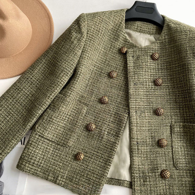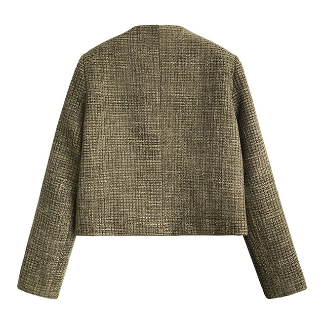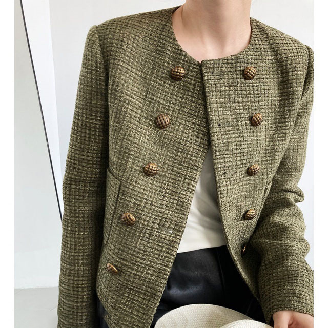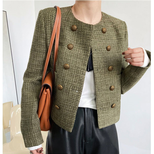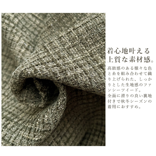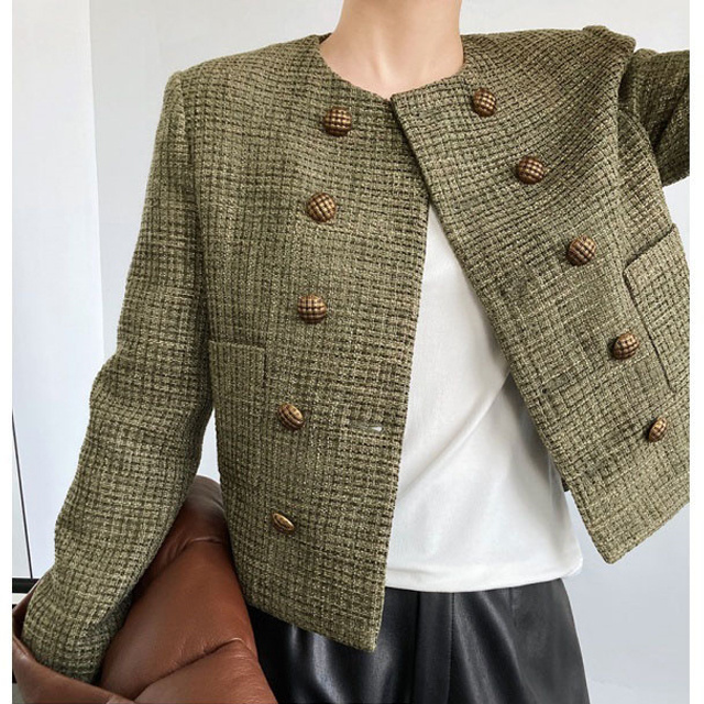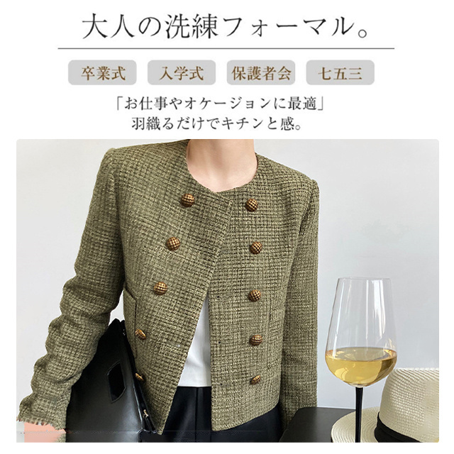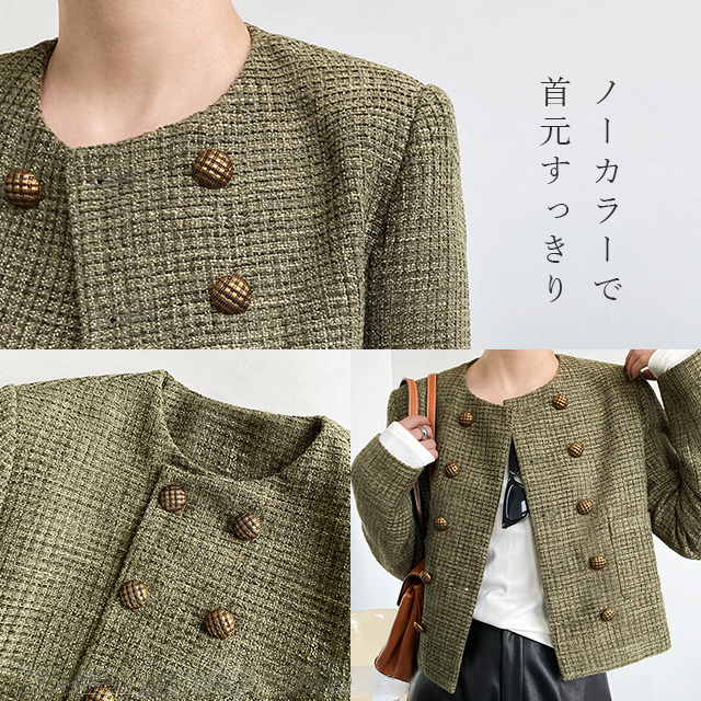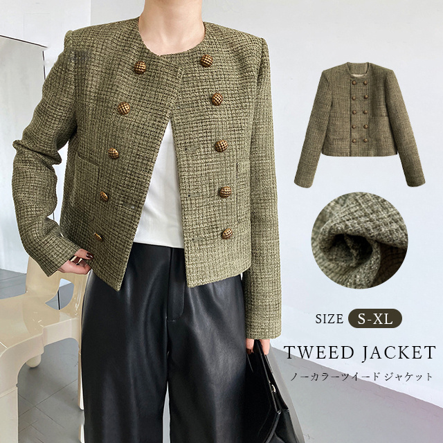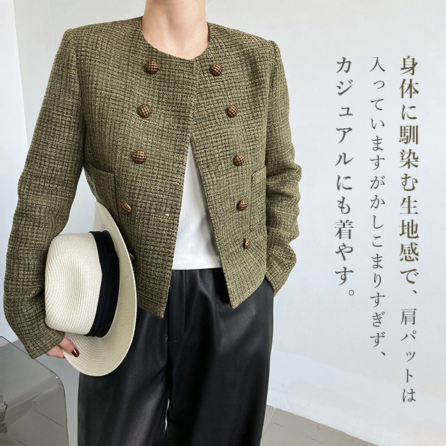 送料無料 春新作 ノーカラー ツイードジャケット レディース 秋 冬 ジャケット ツイード アウター ノーカラ— 大人 ノーカラージャケット 肩パット カーキ オフィス カジュアル ショート丈 きれいめ トップス スーツ フォーマル 長袖