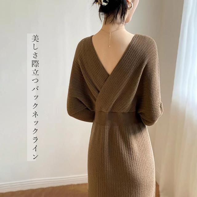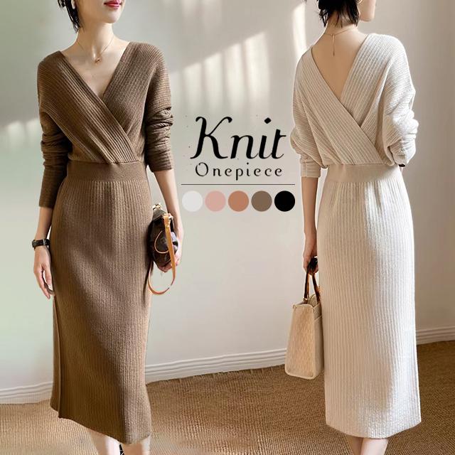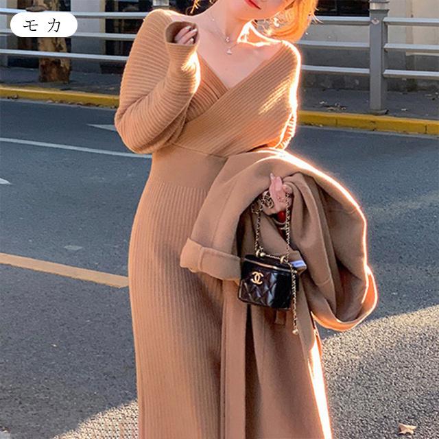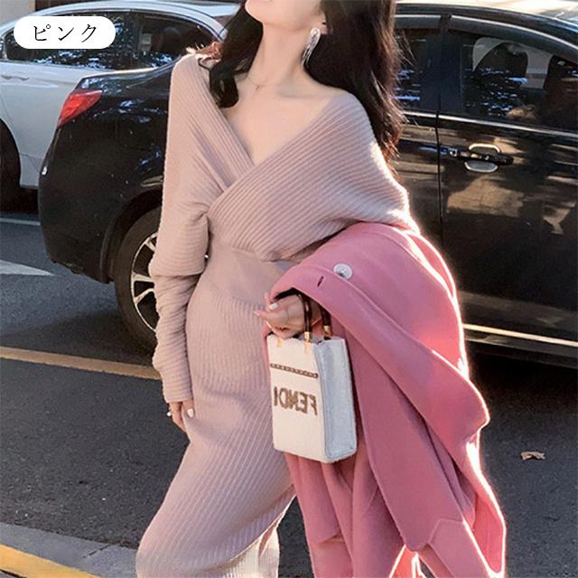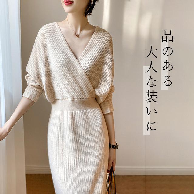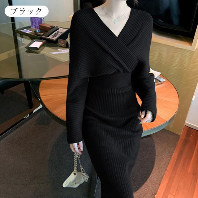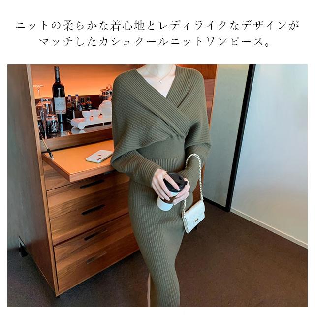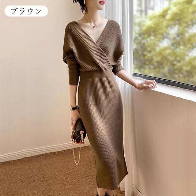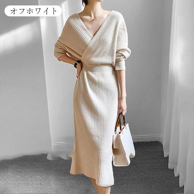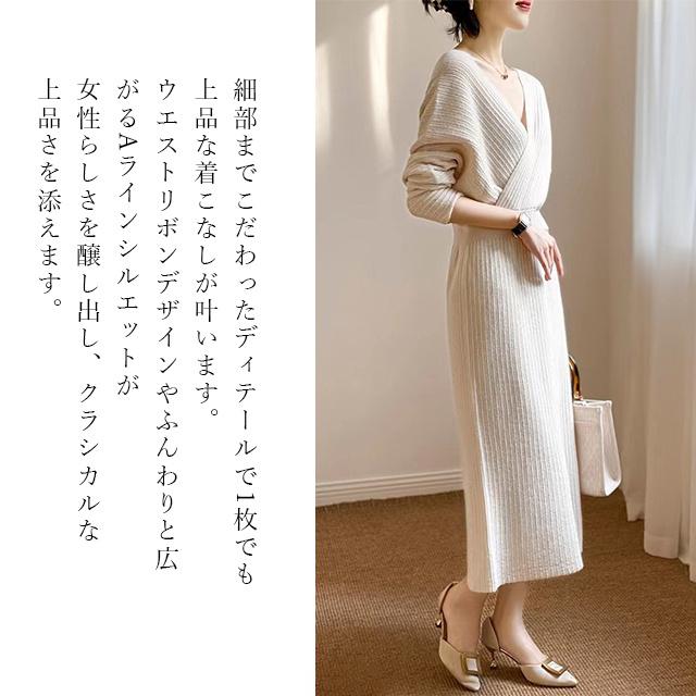 春新作 送料無料 ニット ワンピース ニットワンピース カシュクール Vネック 長袖 厚手 ひざ下丈 ロング丈 お呼ばれ きれいめ 体型カバー レディースワンピース 通勤 ゆったり オフィス オフィスカジュアル ボリュームスリーブ マキシ丈 おしゃれ ミセス 大人
