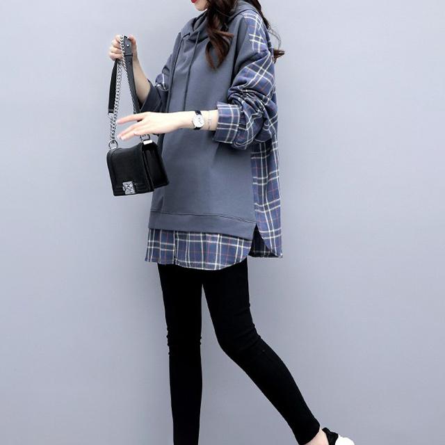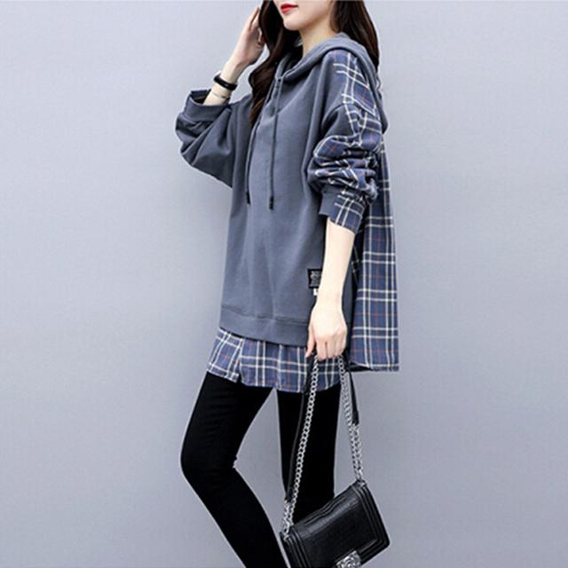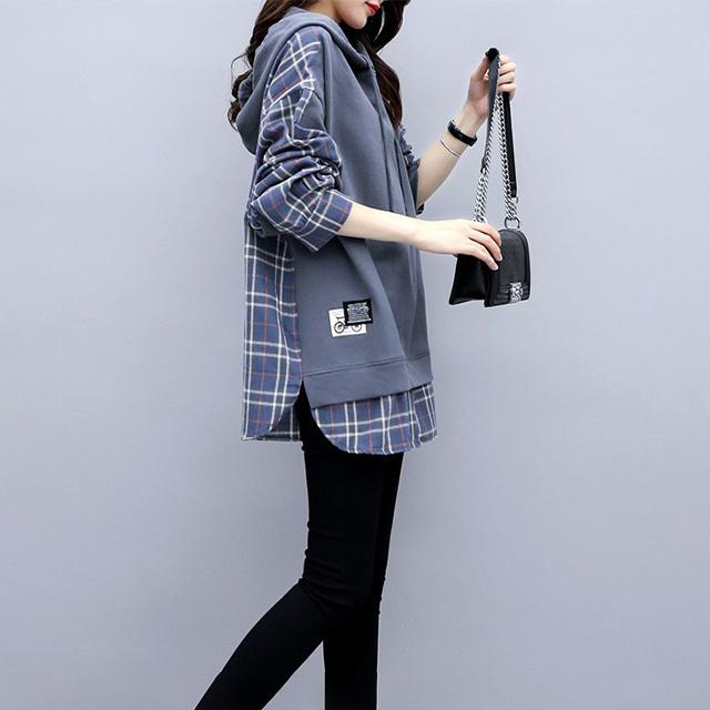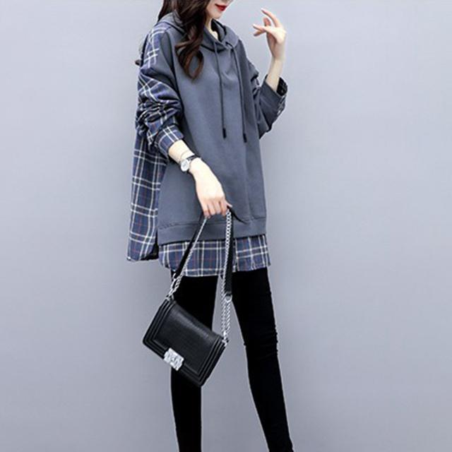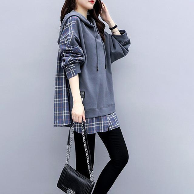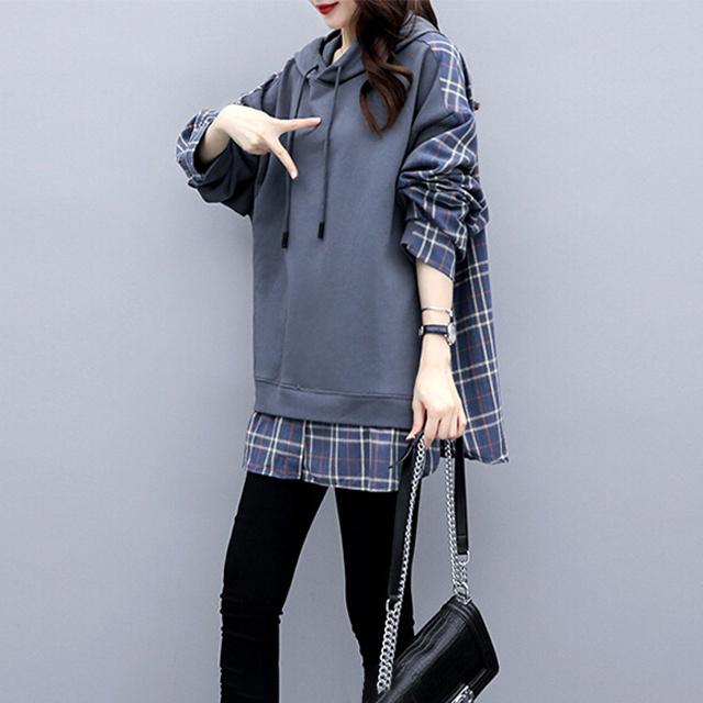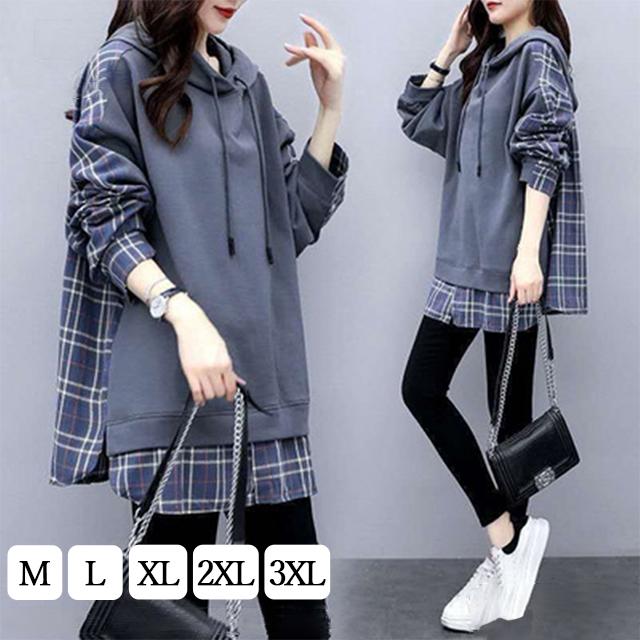最安値挑戦 春新作 送料無料 新作 トップス 新作 レディース スウェット 重ね着風 秋冬 フード付き チュニックトップス 長袖 体型カバー トレーナー チェック 柄 シャツ ドッキング レイヤード 重ね着 カジュアル ゆったり 通勤 着痩せ