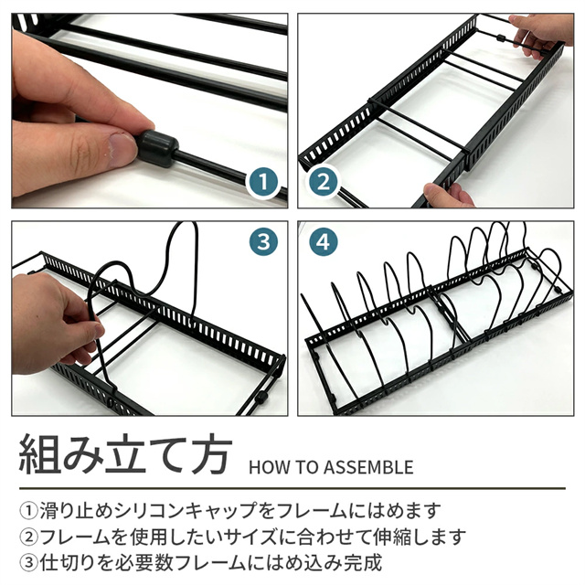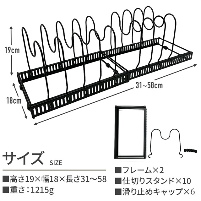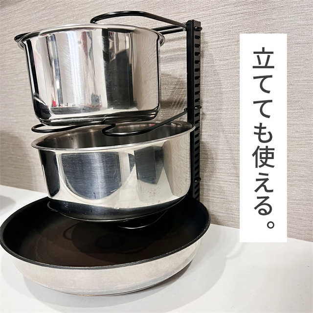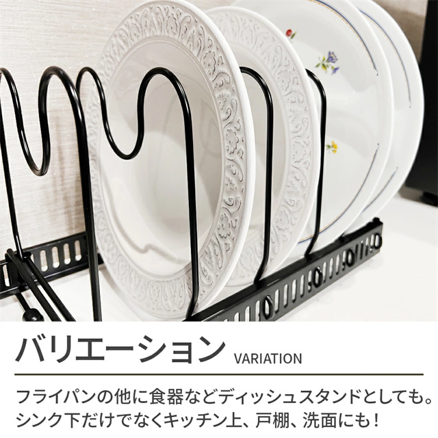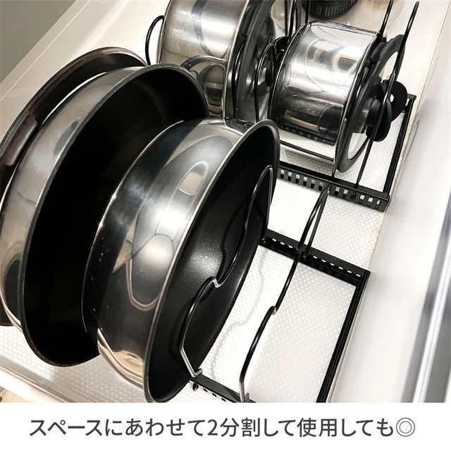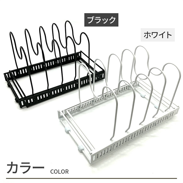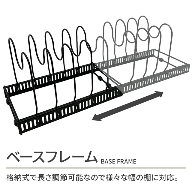 | 特徴 | シンク下を使いやすく整理整頓 伸縮式 フライパンスタンド ベースフレームは格納式で長さ調節が可能なので、様々なサイズのスペースに設置できます。 仕切りスタンドはフレームの穴にはめこむだけで取り付け簡単。 5mmごとに調節できるので深さのあるお鍋、スリムな鍋ふたやまな板も安定して収納することができます。 収納スペースにあわせて2分割で使用することも、立てて使うこともできます。 調理器具はもちろん、お皿などのディッシュスタンドとして、 またキッチン上、戸棚、洗面下など多機能に大活躍します。 |