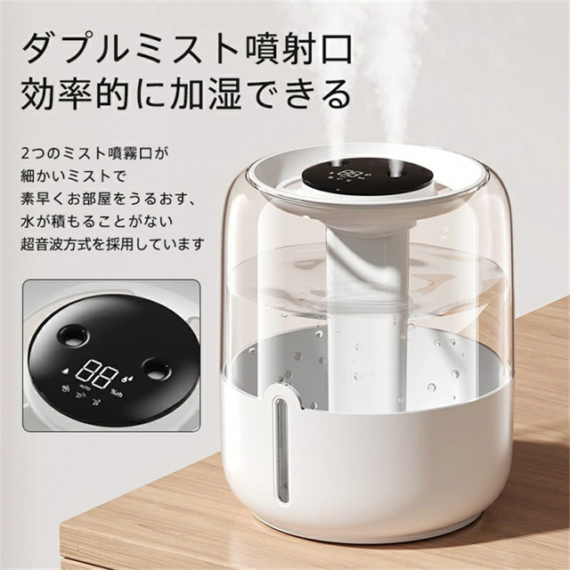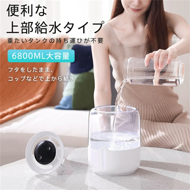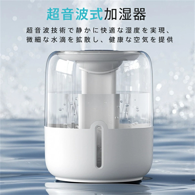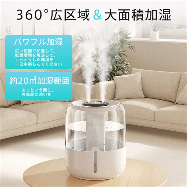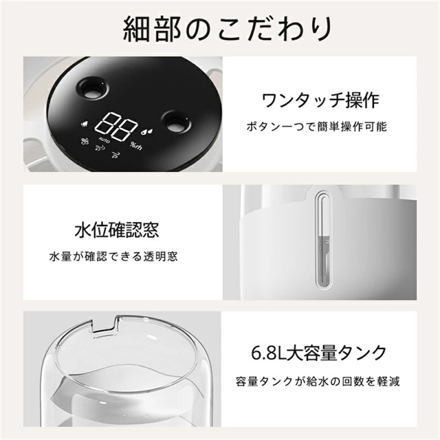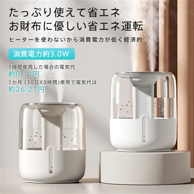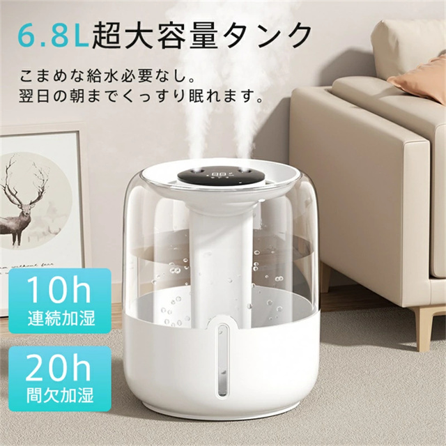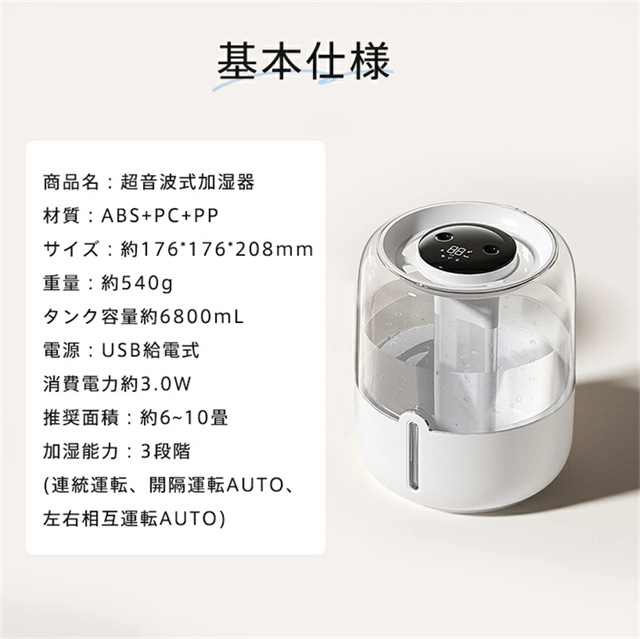 | 特徴 | ◆ダブルミスト噴射口、効率的に加湿できる 2つのミスト噴霧口が細かいミストで素早くお部屋をうるおす、水が積もることがない超音波方式を採用しています。 ◆シンプルな3段階加湿モード 加湿能力:3段階(連続運転、間隔運転、相互間隔運転) ◆リアルタイムの湿度確認 湿度を検知するセンサーを搭載しており、お部屋の湿度が一目で分かります。 ◆6.8L大容量で一晩中ずっと潤う 1回の満タン給水で長時間加湿器できるから、たびたび給水の必要がありません。 ◆LEDライト付きで癒し空間に LEDランプも搭載しているので幻想的な雰囲気を楽しみたい時はライトON。 |
