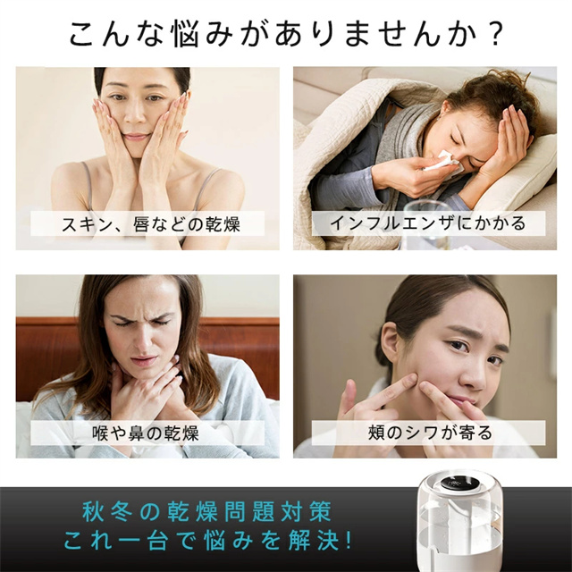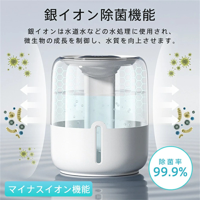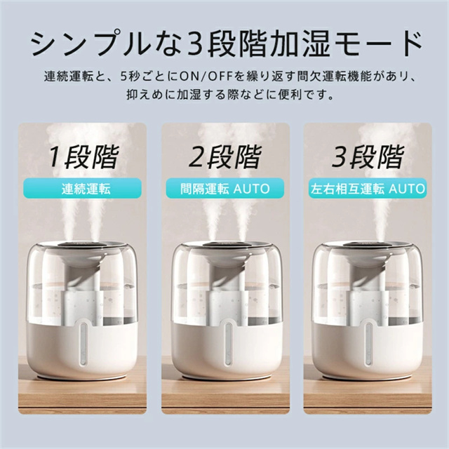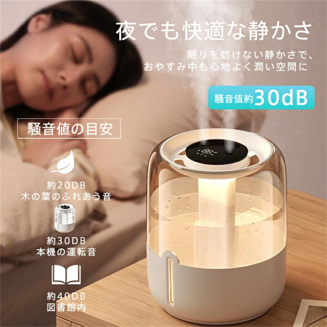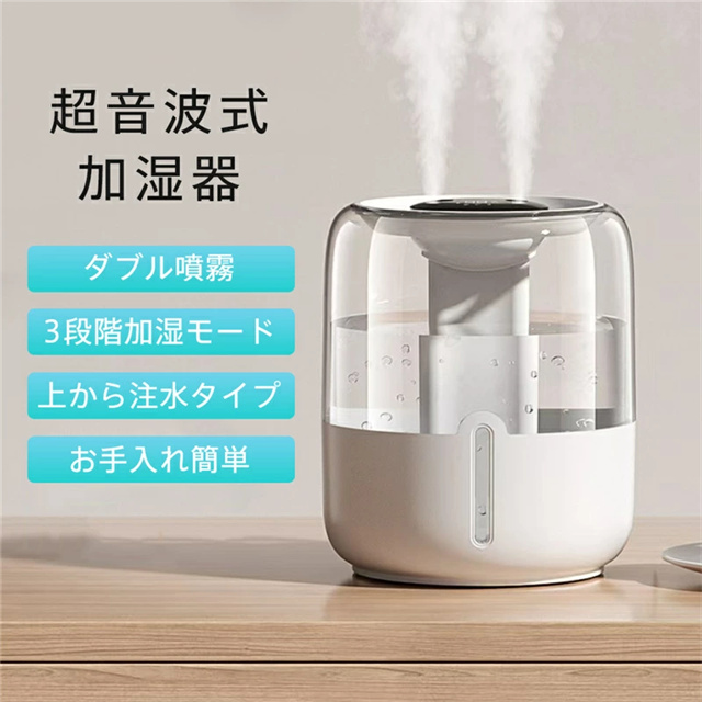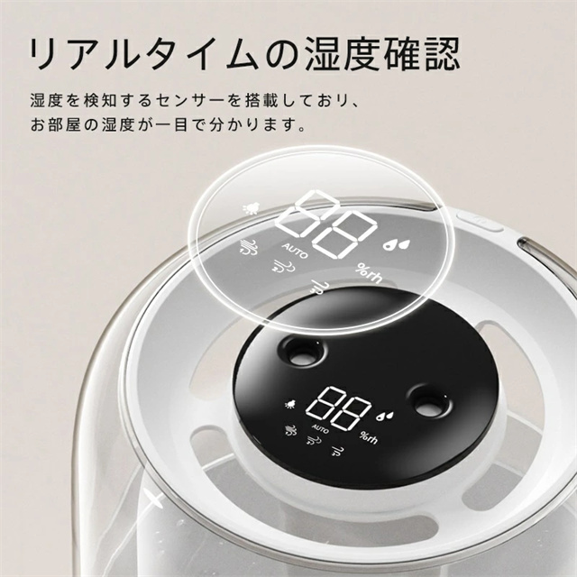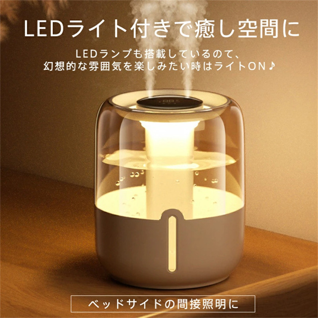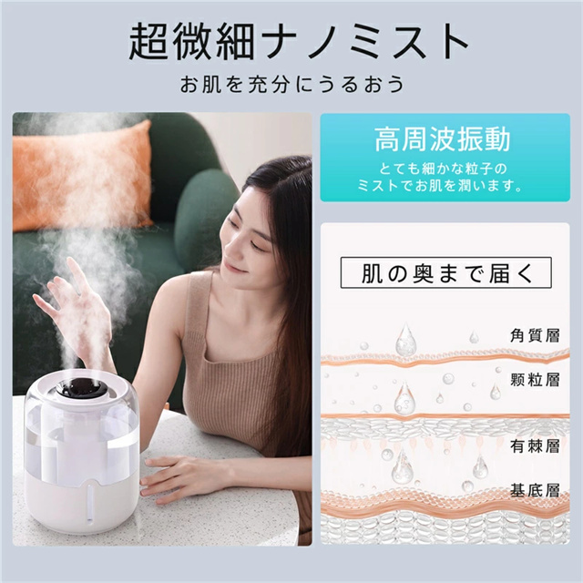 | 特徴 | ◆ダブルミスト噴射口、効率的に加湿できる 2つのミスト噴霧口が細かいミストで素早くお部屋をうるおす、水が積もることがない超音波方式を採用しています。 ◆シンプルな3段階加湿モード 加湿能力:3段階(連続運転、間隔運転、相互間隔運転) ◆リアルタイムの湿度確認 湿度を検知するセンサーを搭載しており、お部屋の湿度が一目で分かります。 ◆6.8L大容量で一晩中ずっと潤う 1回の満タン給水で長時間加湿器できるから、たびたび給水の必要がありません。 ◆LEDライト付きで癒し空間に LEDランプも搭載しているので幻想的な雰囲気を楽しみたい時はライトON。 |