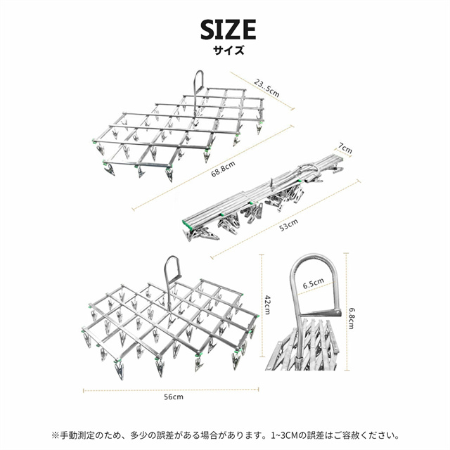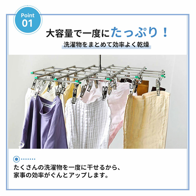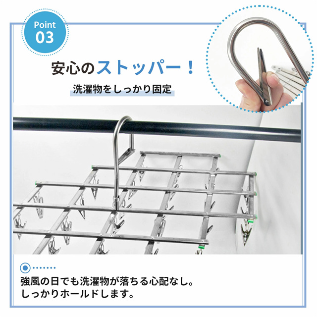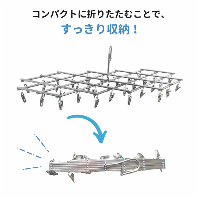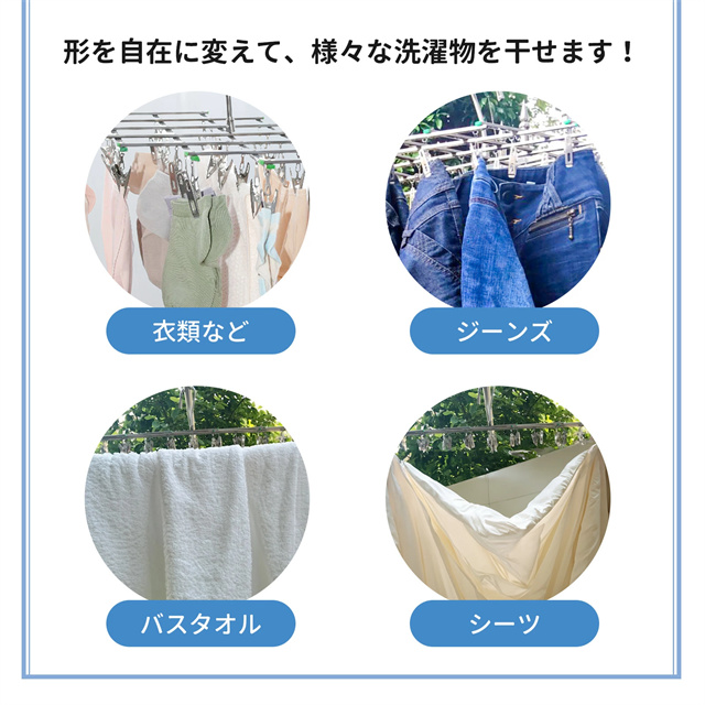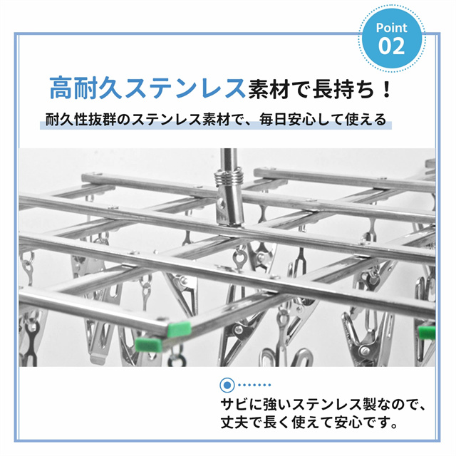| 特徴 | 【伸縮自在★万能ステンレスハンガー】 高品質ステンレス製の折りたたみ式ハンガー!自由自在に伸縮できるので、お好みの形状にアレンジ可能。様々な洗濯物に対応する便利な多機能設計で、毎日のお洗濯をもっと快適に 【35個ピンチ搭載★圧倒的な収納力】 なんと35個もの錆びにくいステンレスピンチを装備!たくさんの洗濯物をまとめて干せる大容量設計。靴下やハンカチから大物まで、これ1台で家族全員の洗濯物をしっかりホールド 【超軽量&コンパクト★省スペース収納】 使わない時は折りたためるスマート設計!狭いスペースにすっきり収納可能。軽量で持ち運びラクラク、旅行やアウトドアにも最適なトラベルサイズ。 【安心の固定機能★使いやすさ抜群】 便利なリング固定&ストッパー機能搭載!強風でも洗濯物が飛ばされる心配なし。取っ手部分もリングでしっかり固定できて、安定感抜群の使い心地です。 【高品質ステンレス★長く使える耐久性】 サビに強い高品質ステンレス素材使用!耐久性バツグンで清潔・衛生的。毎日のお洗濯に安心して使える確かな品質をお届けします。 |