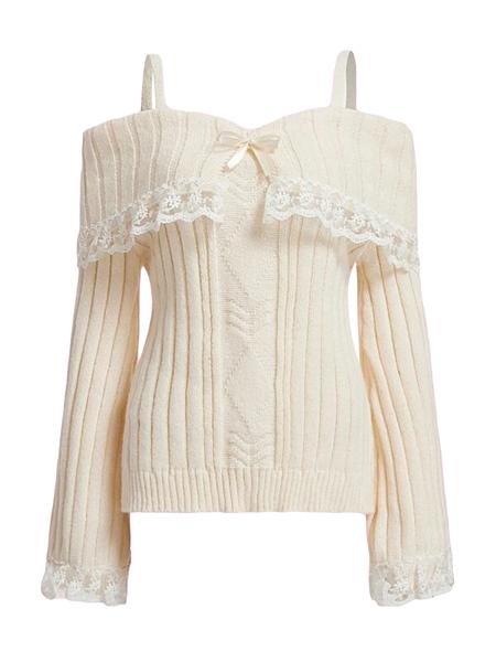 女性用コールドショルダーセーター長袖コントラストレースニットプルオーバーリボンフロントジャンパートップス